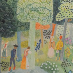 "A két méter magas és öt méter hosszú kép központjában Árgyélus királyfi és Tündér Ilona története áll, amely számos 19. századi irodalmi feldolgozásban és több népmesei változatban is ismert. Árgyélus királyfi és Tündér Ilona története, a férfi és nő egymásra találásának motívuma sokféle formában elterjedt toposz, azaz vándormotívum. Berki Violánál a kép bal felső sarkában a halasi városháza és a református templom tornya látható, középen pedig egy hosszan ívelő fehér fal hullámzik végig. A falon innen az e világi, mindennapi boldogság szereplőit látjuk, a gáláns huszárfigurákat, parasztlegényeket és ünneplőbe öltözött parasztlányokat, majd kiskapu vezet a falon túl a mesebeli édenkertbe, ahol szoborcsoportok, csobogó szökőkutak, intim társalgásba mélyedő párok, egzotikus madarak, dús lombú fák és színes virágok társaságában, aranyalmafa alatt, baldachinos sátorban jelenik meg Árgyélus királyfi és Tündér Ilona. A mesebeli kert az örök szeretet és szerelem édene, az aranyalma pedig a szeretet almája, amely nem a paradicsomból való kiűzetést, hanem a szeretet örök, édeni állapotát jelképezi. A Boldogság felé Berki Viola gondolkodásának idilli oldalát, a festőnő szeretetfilozófiáját tárja elénk."[3]