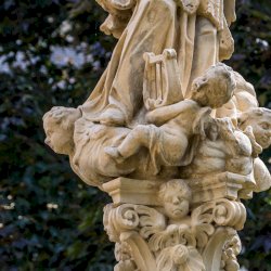 A kerubfejes, gyümölcsdíszes oszlopfőn Nepomuki Szent Jánost már a mennyei dicsőségben látjuk, éneklő angyalok társaságában.