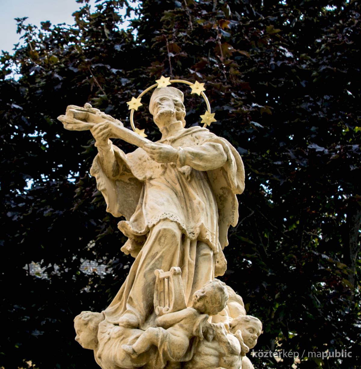Feje körül az ötcsillagos glória látható, mely vértanúságának okára, a gyónási titok megtartására utal. (Tacui, azaz hallgattam, ezért meg kellet halnom.)
