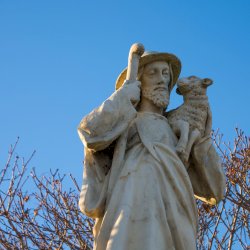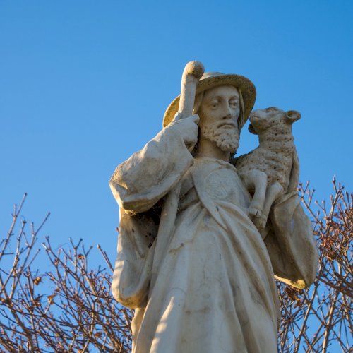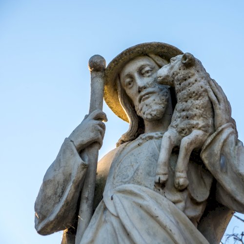 Pásztorbottal, vállán egy báránnyal a Jó Pásztort személyesíti meg, amelyről Ezekiel próféta (Íme, én magam keresem fel juhaimat és viselem gondjukat. Ez 34,1-11) és Szent János evangéliuma (https://szentiras.hu/KNB/Jn10) (Jn10) is ír.