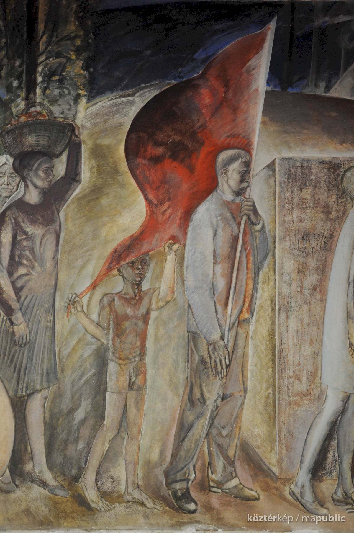 "A falképen Patay társadalmunk két nagy dolgozó osztályát szimbolizálja. Balról a mezőgazdaság jelképeit csoportosítja sajátos hatású piramidális együttesbe, jobbról a kohászok hősiesen szép munkáját jelképező felvonulók és egy ünnepélyre készülődő család látható. Patay ezúttal eddigi kompozícióitól eltérő megoldást alkalmazott: a mű geometriai központjába egy fal tömbjétől zárt együttesbe fogott női csoportot festett. A női figurák elrendezése a reneszánsz gyűrű formájú kompozíciós megoldását újítja meg. Nem eseményt vagy szituációt rögzítő alakok ezek, hanem kellemes megjelenésükkel a nő megváltozott társadalmi helyzetét szimbolizálják."[2]