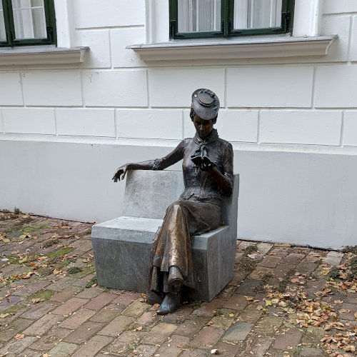 A város és a megye prominens személyei, és számos érdeklődő jelenlétében hullott le a lepel, sorban a harmadik új szoborról. A szürke mészkő padon ülő törékeny fiatal női alak életnagyságú, korhű divatos hosszú zsabós ruhában és bokacipőben, fején kis kalappal, hosszú kontyba fonott hajjal, kezében könyvvel ábrázolta a szobrászművész. A könyvet a bal kezében tartja, jobbját lazán a padra lógatja, lábait keresztebe rakva ül. A könyv felett elnéz a távolba, szinte hívogat, hogy ülj egy percre mellé a kis szűk helyre. A szobrász lánya, is jelen volt az avatáson, aki modellt ült a szoborhoz. (Megkapóan nagy volt a hasonlóság, volt szerencsém beszélgetni vele.) Az avatáson részt vett számos helyi művész között, az alkotó, és családja is.