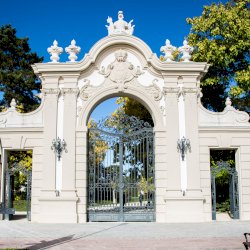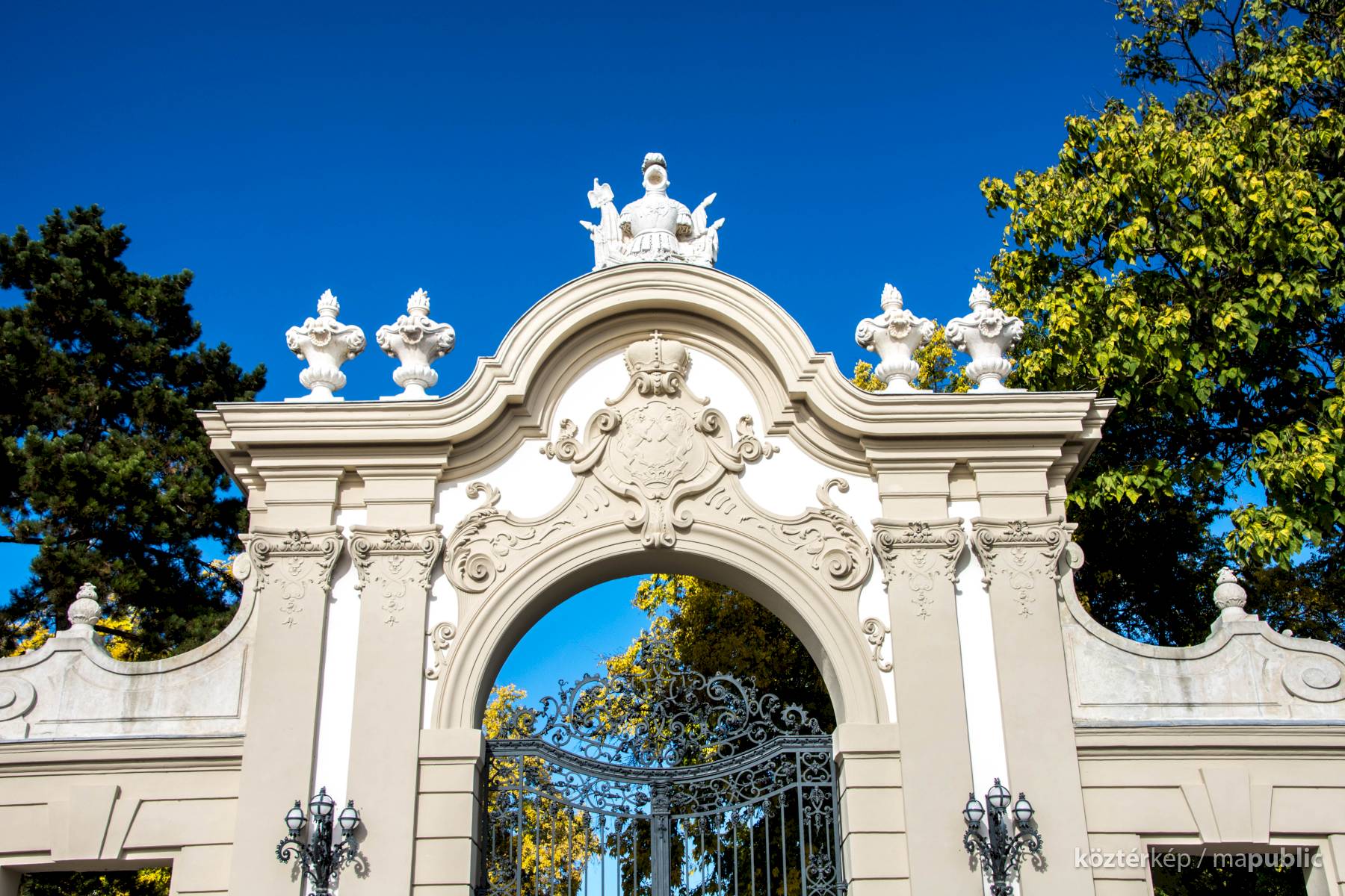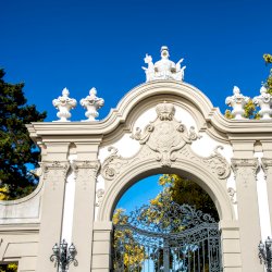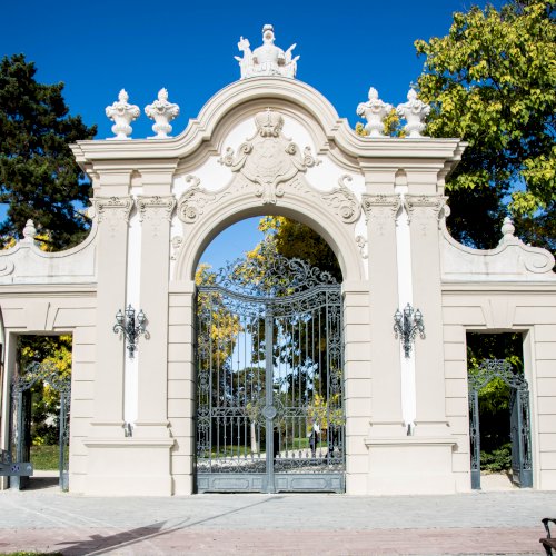 A parkba vezető kovácsoltvas kapu fölött a Festetics család címere látható.