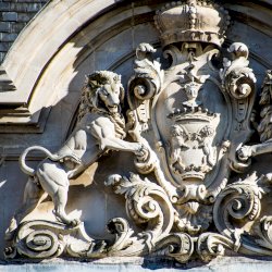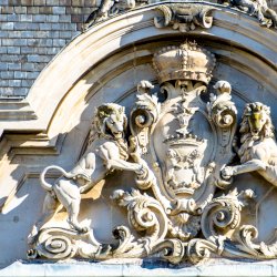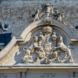 A címerleírás: „Kék csücsköstalpú pajzsban lebegő arany koronán, két, kivont kardot tartó, egymással szembefordult arany oroszlán áll. A pajzson lévő rostélyos sisakra helyezett arany koronából jobb lábával követ tartó, jobbra fordult daru emelkedik ki. A pajzsot egy-egy arany oroszlán tartja, alul kék színű aranybetűs szalag övezi, melyen a Deum time, regem honora (Az Istent féld, a királyt tiszteld) feliratot olvashatjuk.)"[2]