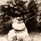 Felirat:'DR TOLNAY SÁNDOR/1747-1818/egyetemi tanár/A magyar állatorvos képzés megszervezőjének/emlékére emelte hálás kegyelettel/1937-ben/a magyar állatorvosi kar.' Időközben az emlékművet kiszabadították a ráfonódó növényzetből, a két kiskutya viszont eltűnt a vízzel együtt.