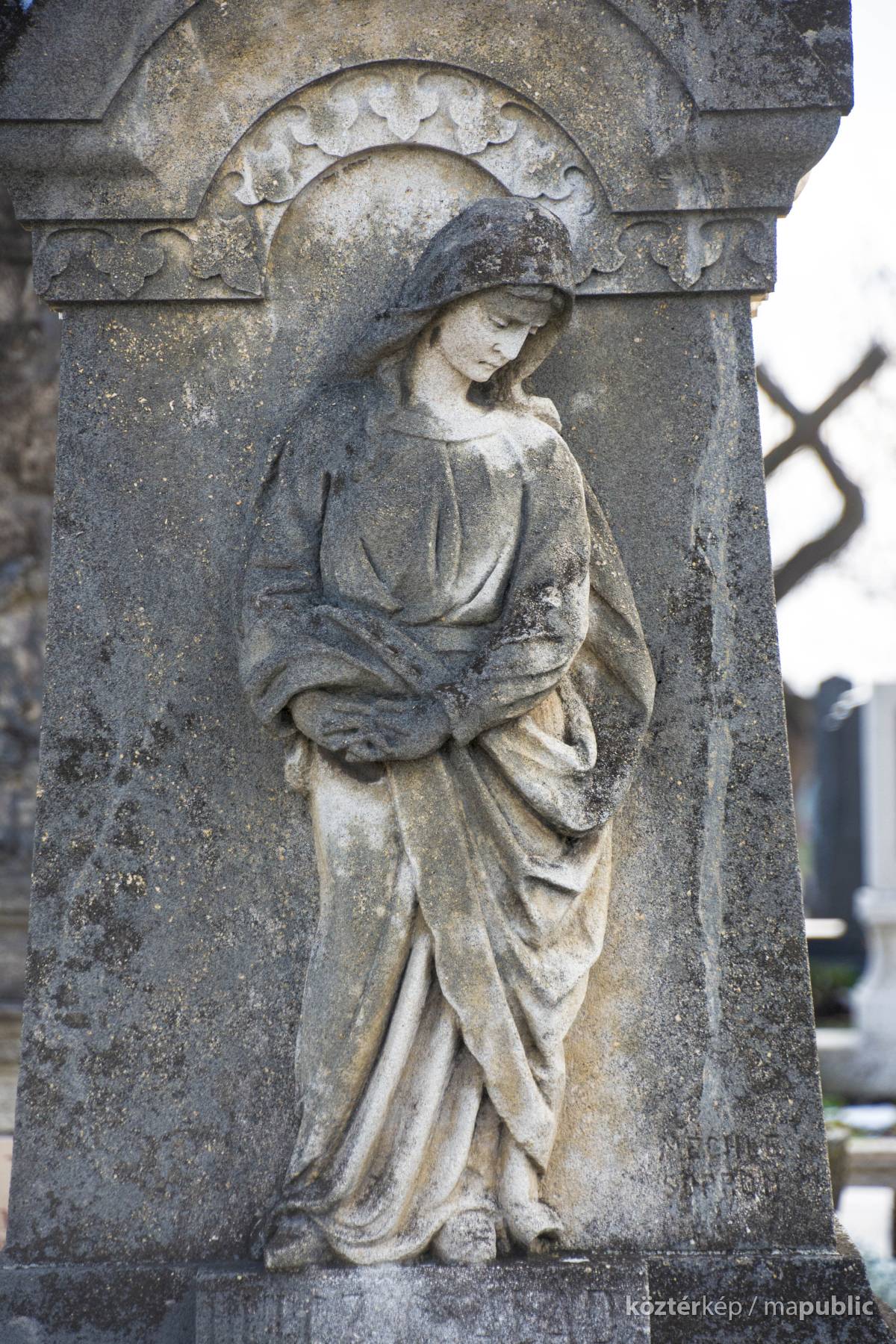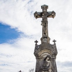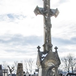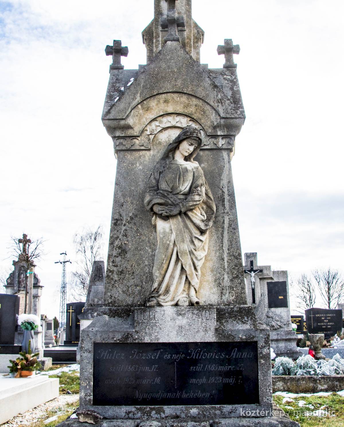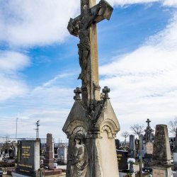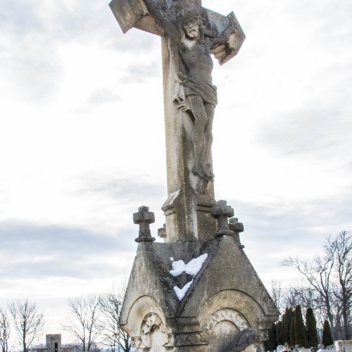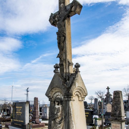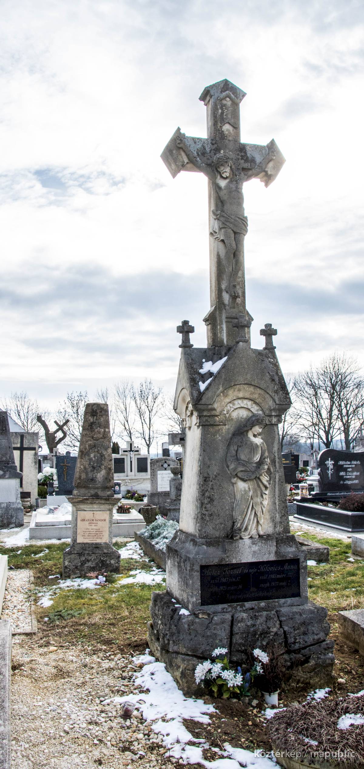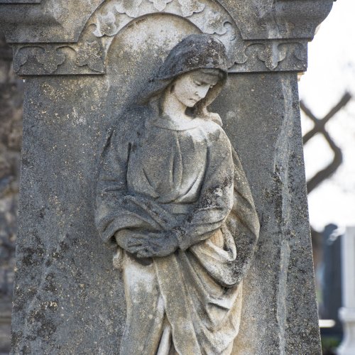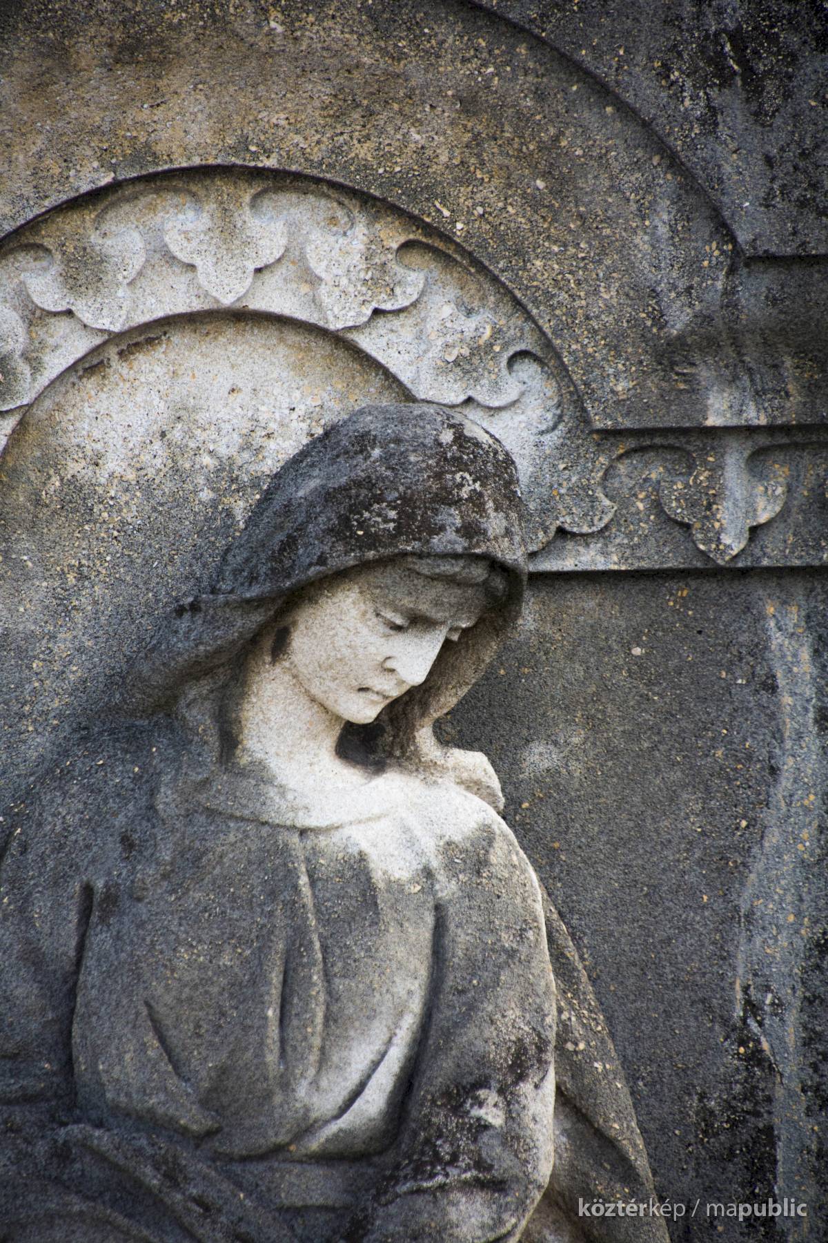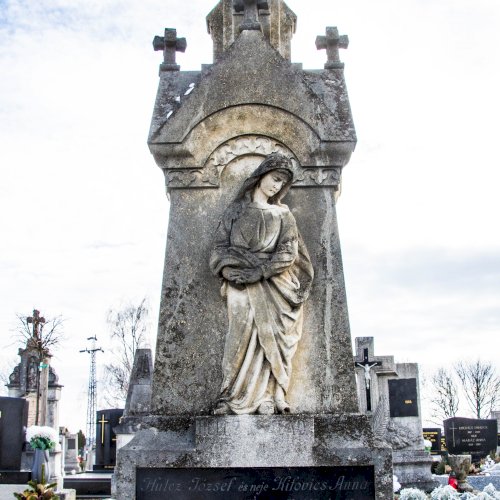 A Hulcz család síremlékén a megfeszített Krisztust ábrázoló feszület alatt a Fájdalmas Anya alakja áll.