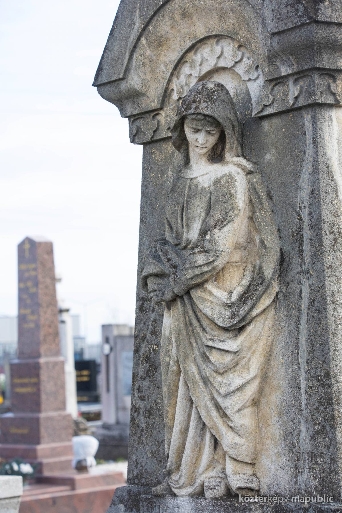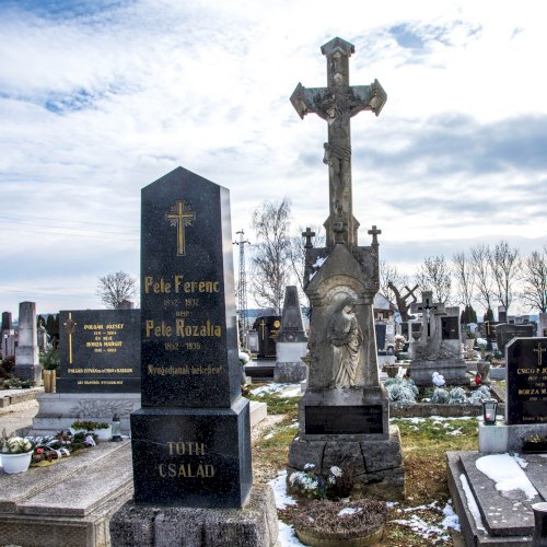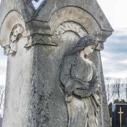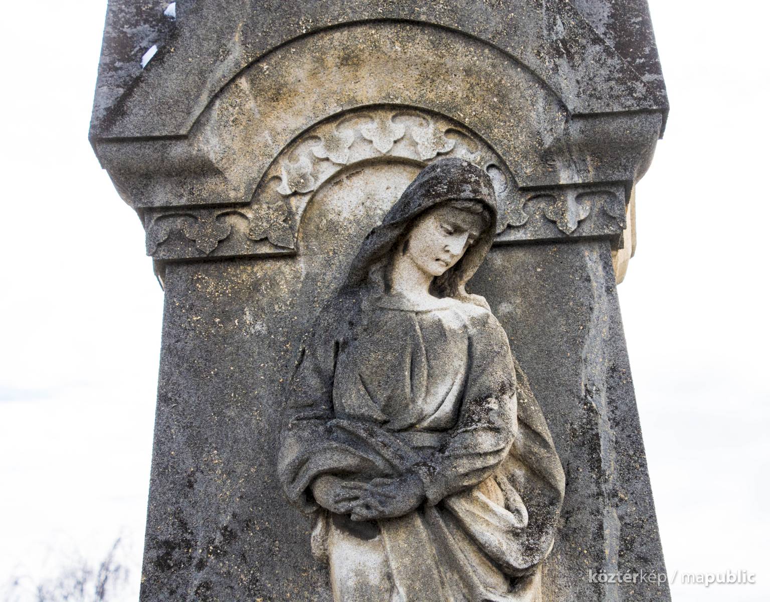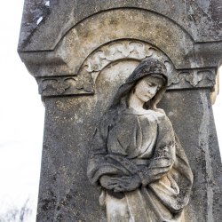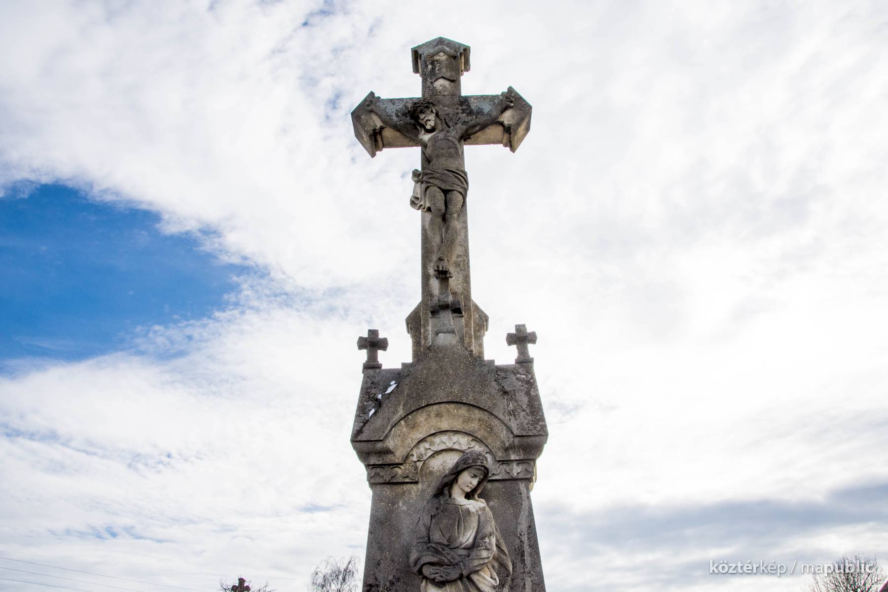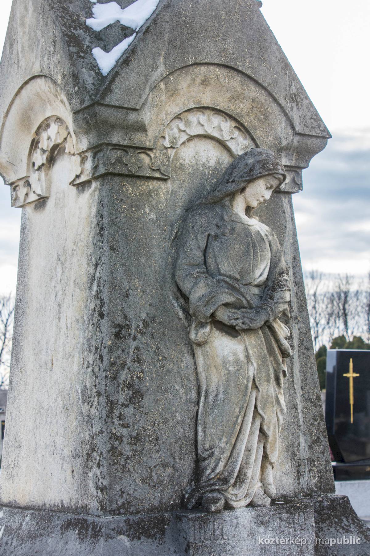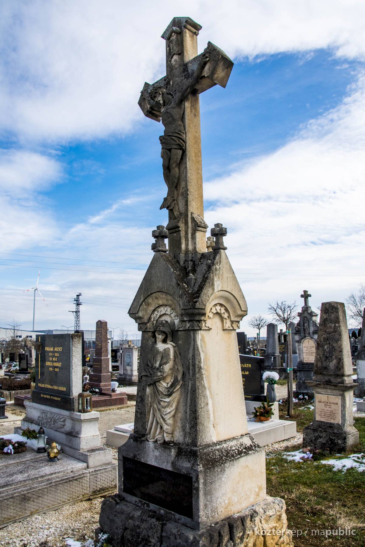 A Hulcz család síremlékén a megfeszített Krisztust ábrázoló feszület alatt a Fájdalmas Anya alakja áll.