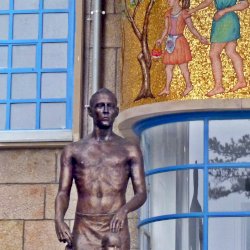 Ez a második idézet ad magyarázatot arra, hogy miért látszanak az épület archív fotón a jelenlegi szobrok helyén hatalmas kör alakú, majd szögletes virágvázák. (Itt: https://www.kozterkep.hu/6450/csaladi-elet-es-orvosi-hivatas-mozaik-friz#vetito=225927)