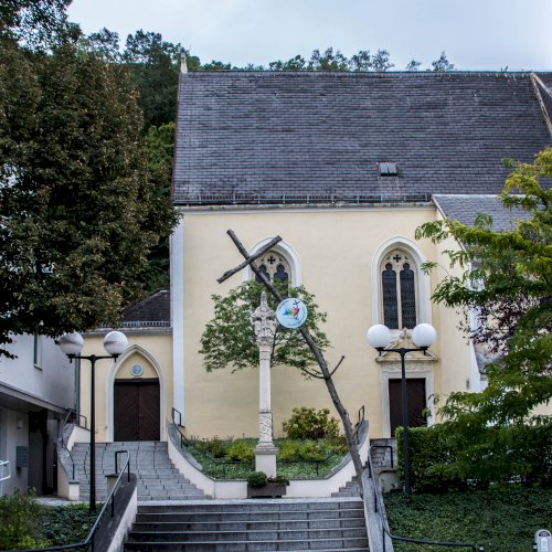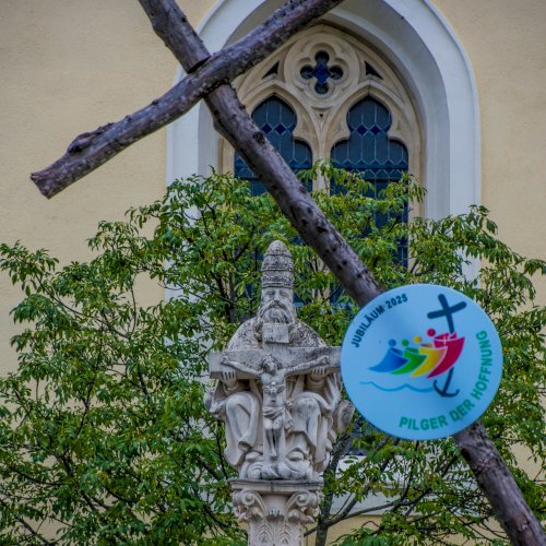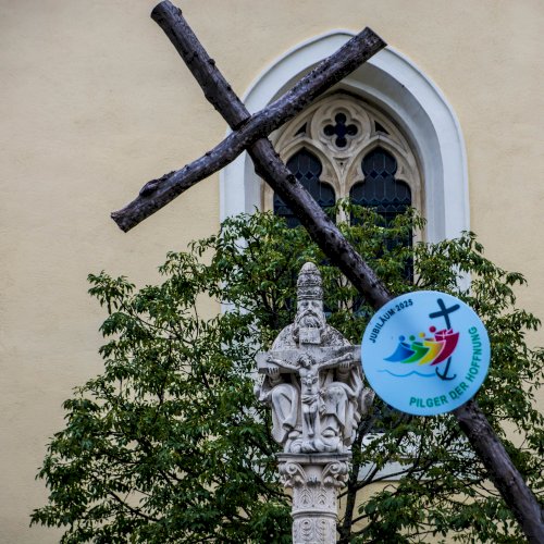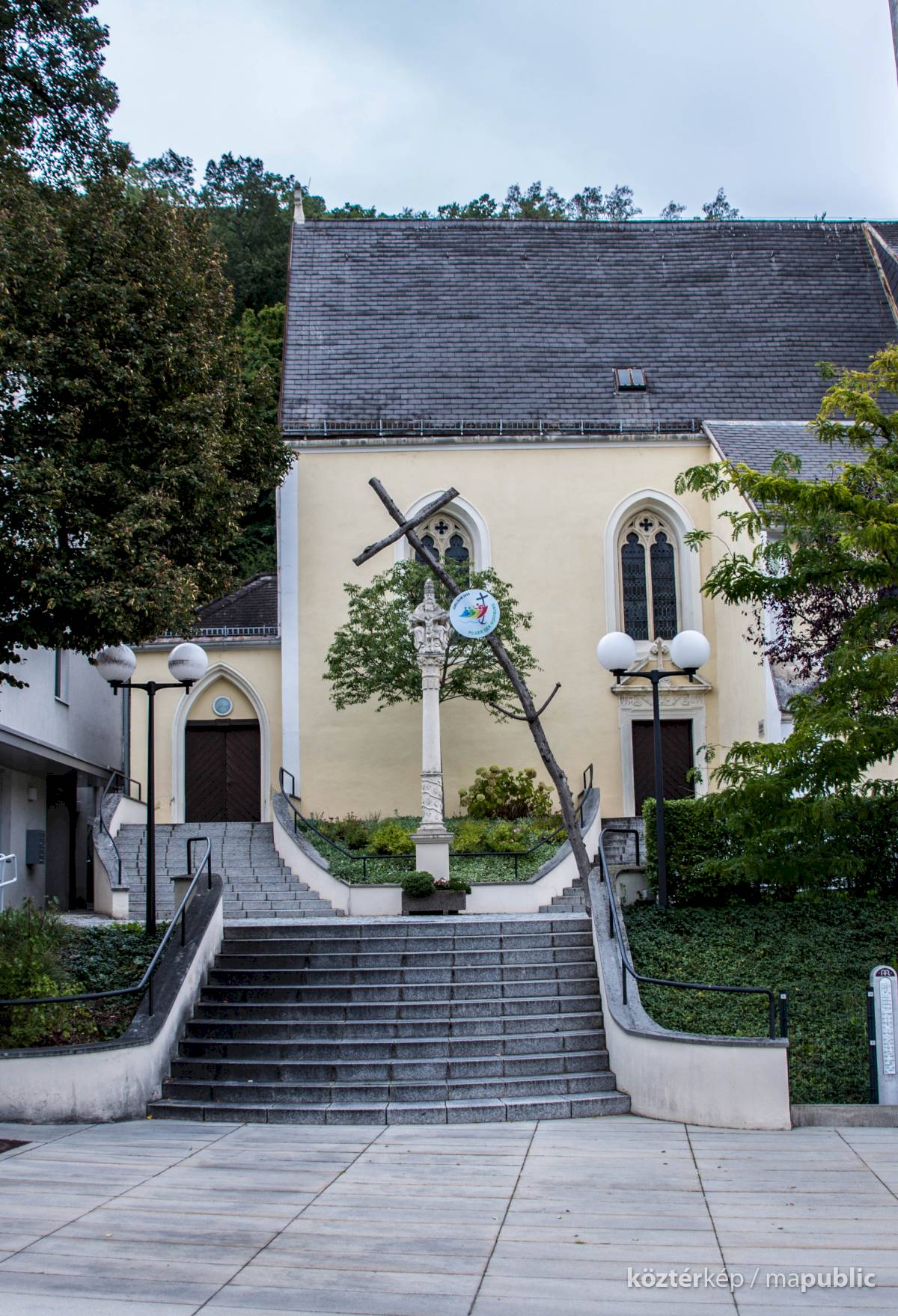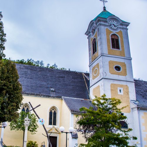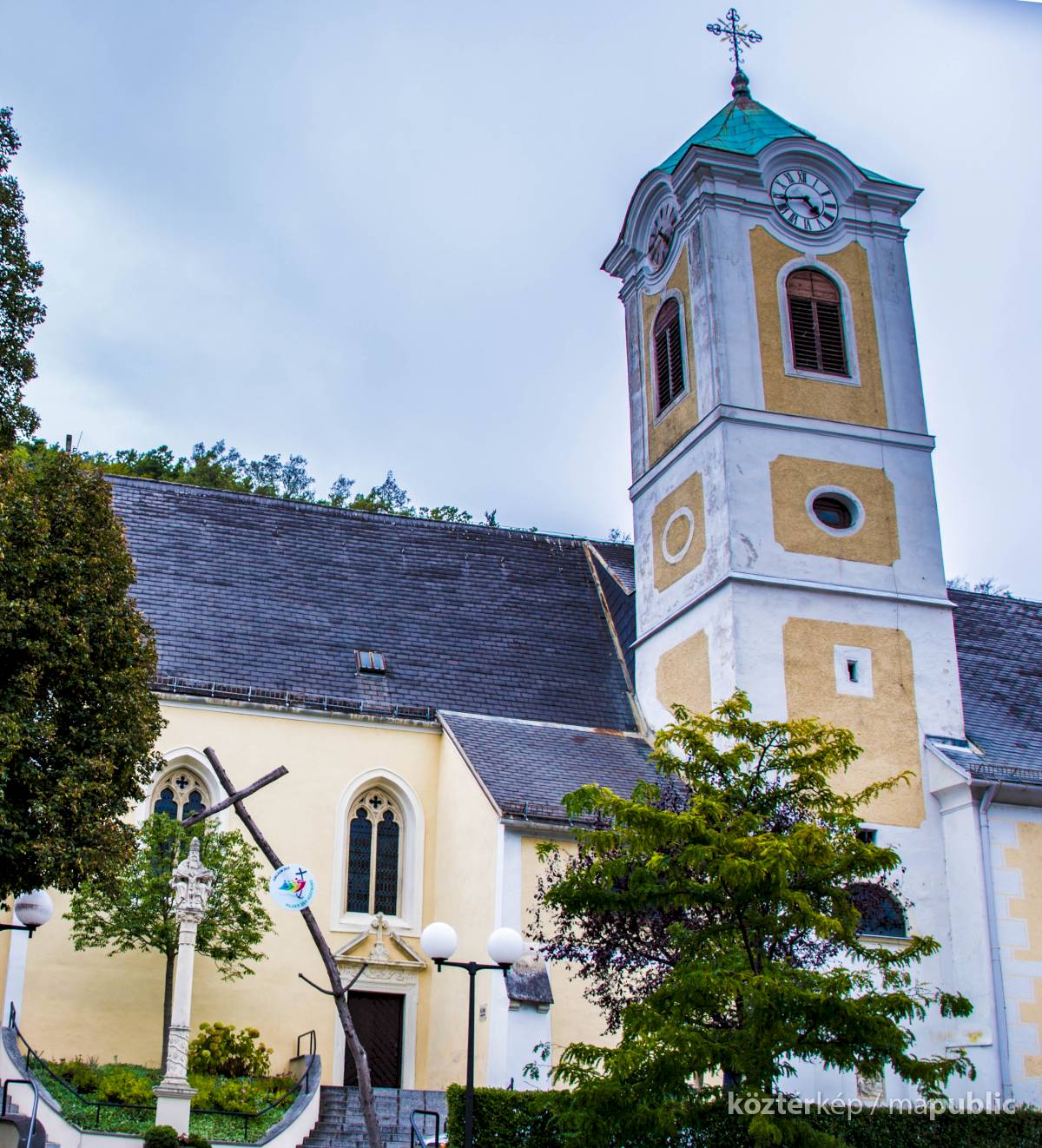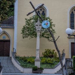 A szőlőindás díszítésű 1700-ban állított Szentháromság-oszlop a Szűz Mária mennybevétele tiszteletére szentelt templom előtt áll.[2]