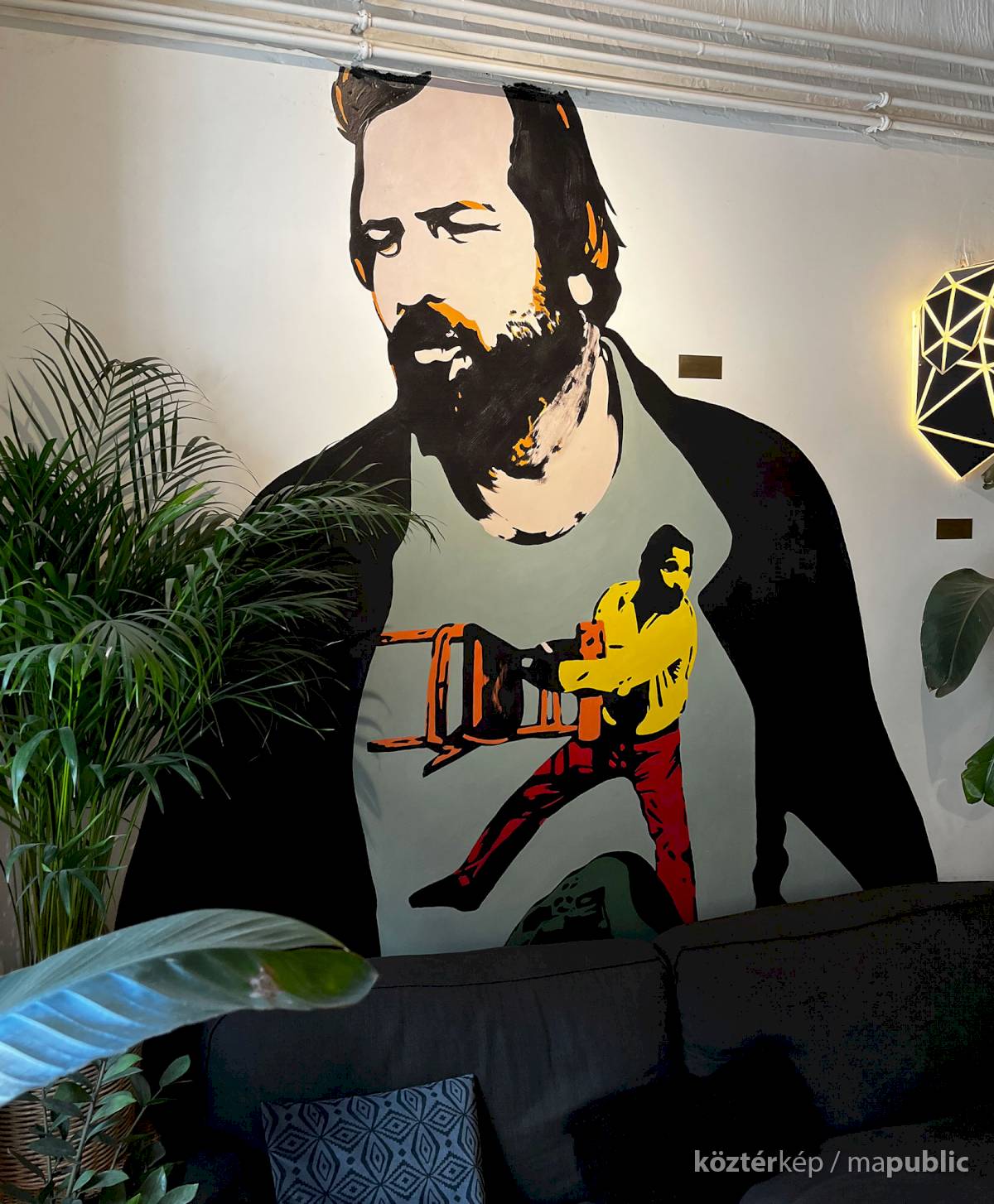 Idén még mozgalmasabb a város élete, mert Veszprém lett Európa Kulturális Fővárosa. Követem a programokat számos felületen, mikor egy koncert közvetítésében megpillantottam az egyik kedvenc filmem plakátját kinagyítva a falon. Na mondom, ezt nekem élőben kell látnom. Következőleg Veszprémben járva megkerestem a Papírkugya nevű kultúrbisztrót, hogy megörökítsem az alkotást. A vendéglátó egységbe lépve balra, a zenekari dobogó melletti falat díszíti a színes festmény, amin Bujtor István létható Ötvös Csöpi szerepében.