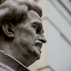 Életnagyságú szobra a császári palota és az Ágoston-rendiek temploma közelében áll.