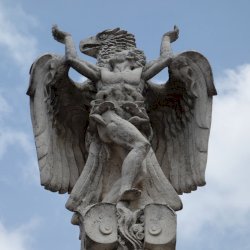 A ház előtti téren áll a két legalább nyolc méter magas oszlop tetején lévő szobor.
