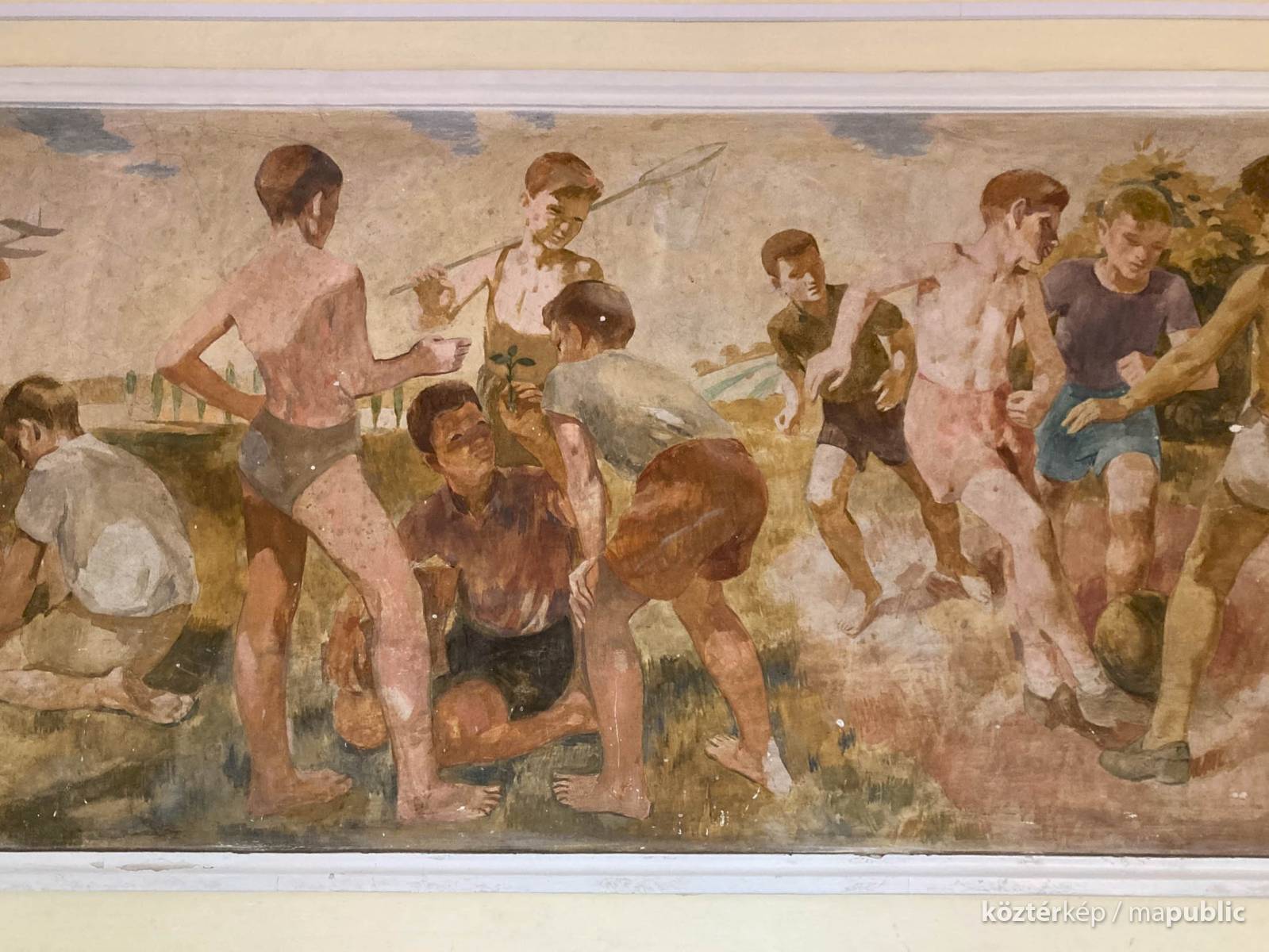 Az első emeleti zsibongóban található Schey Ferenc festőművész falfestménye, melyen fiatal fiúk három csoportja látható. A bal oldalon repülőgép modellekkel játszanak, erről kapta nevét a műalkotás. Előtérben épp egy repülőmodell összeállításán fáradoznak, miközben egyik társuk mögöttük egy már kész modell reptetésére készül. A kép közepén egy ülő fiút állnak körbe a többiek, egyikük kezében rovar/lepkeháló látható, míg jobb oldalon egy seregnyi fiú focizik. Szignó nem található a falfestményen.