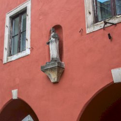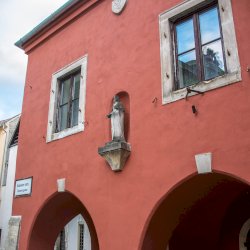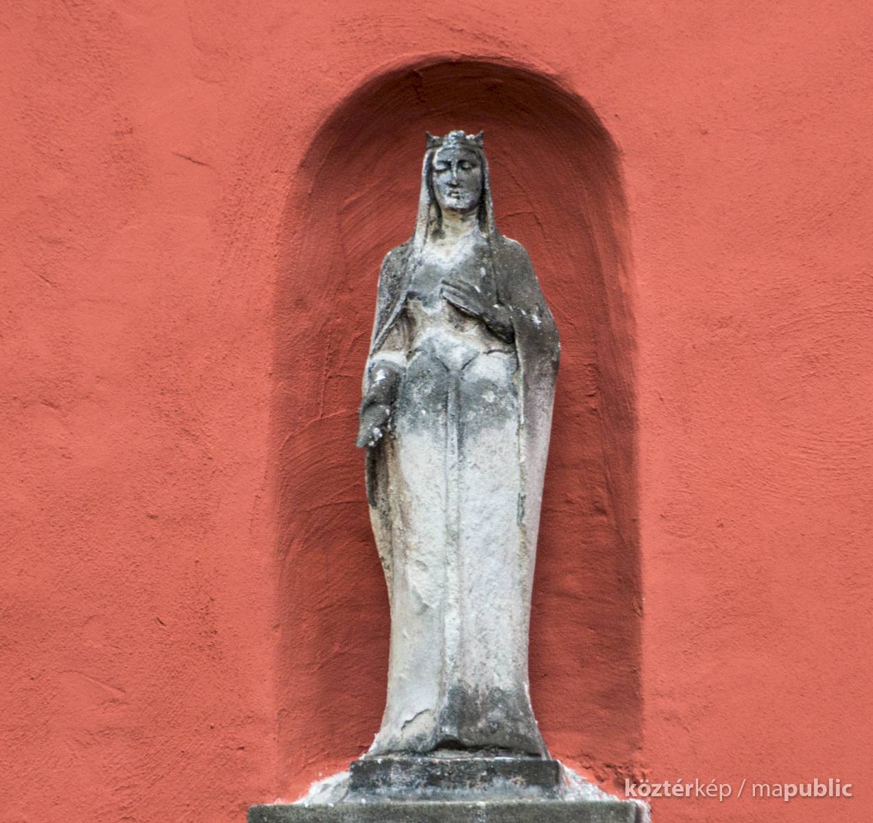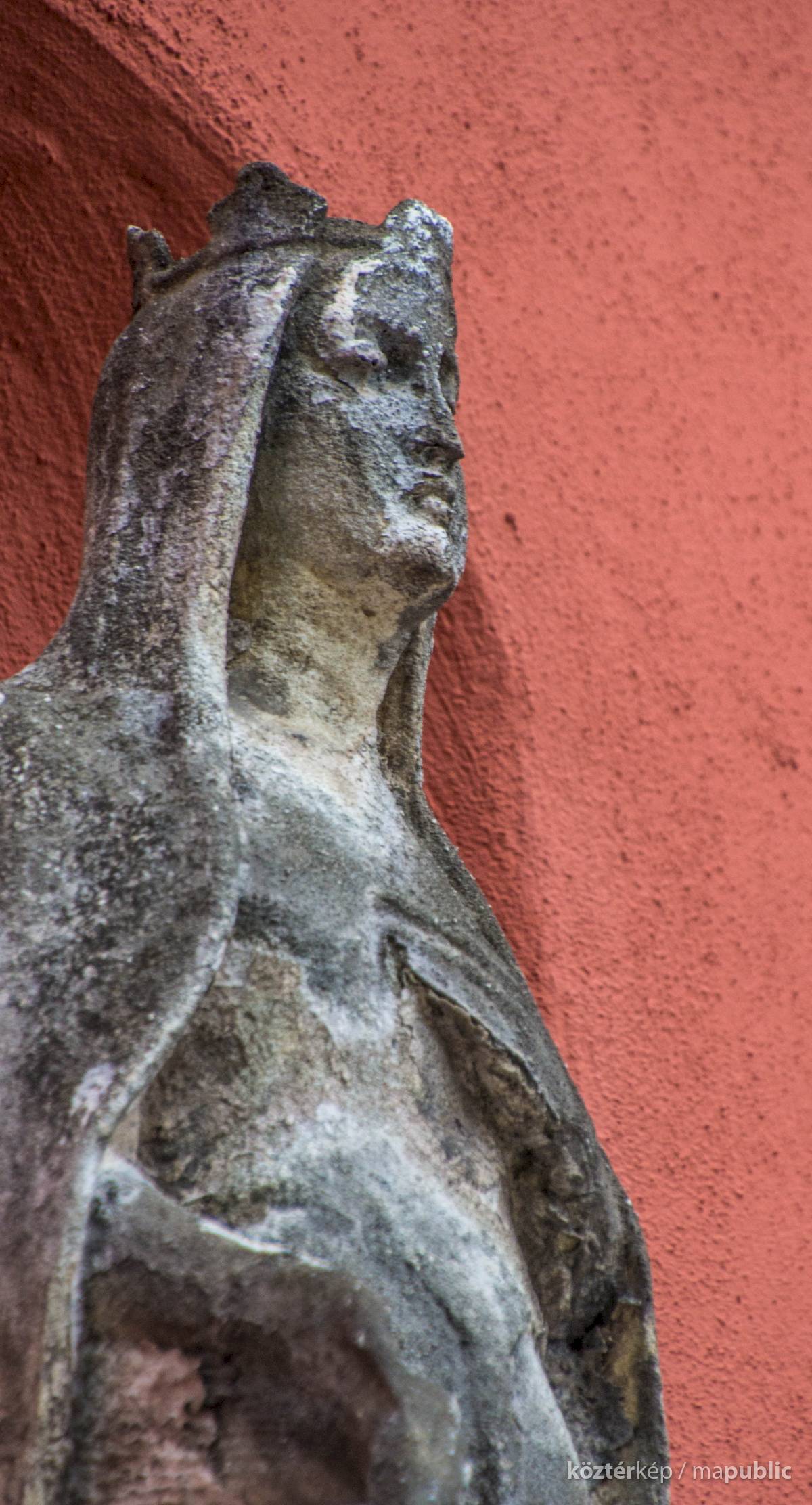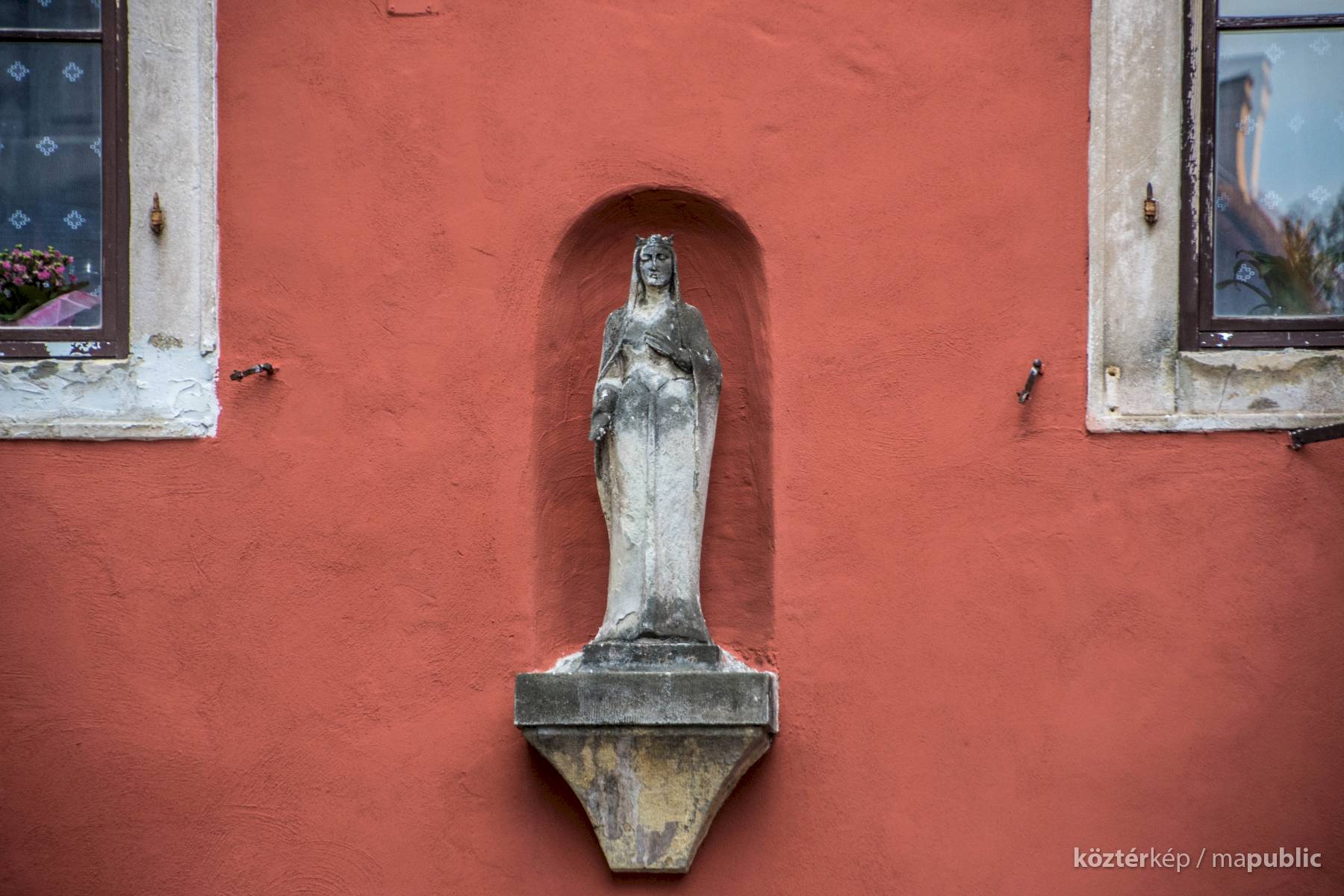 A ház homlokzati fülkéjében álló női alak koronát visel, kezében az alamizsnálkodás jelképeként kenyeret tart.