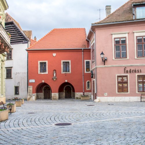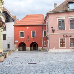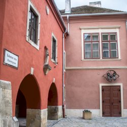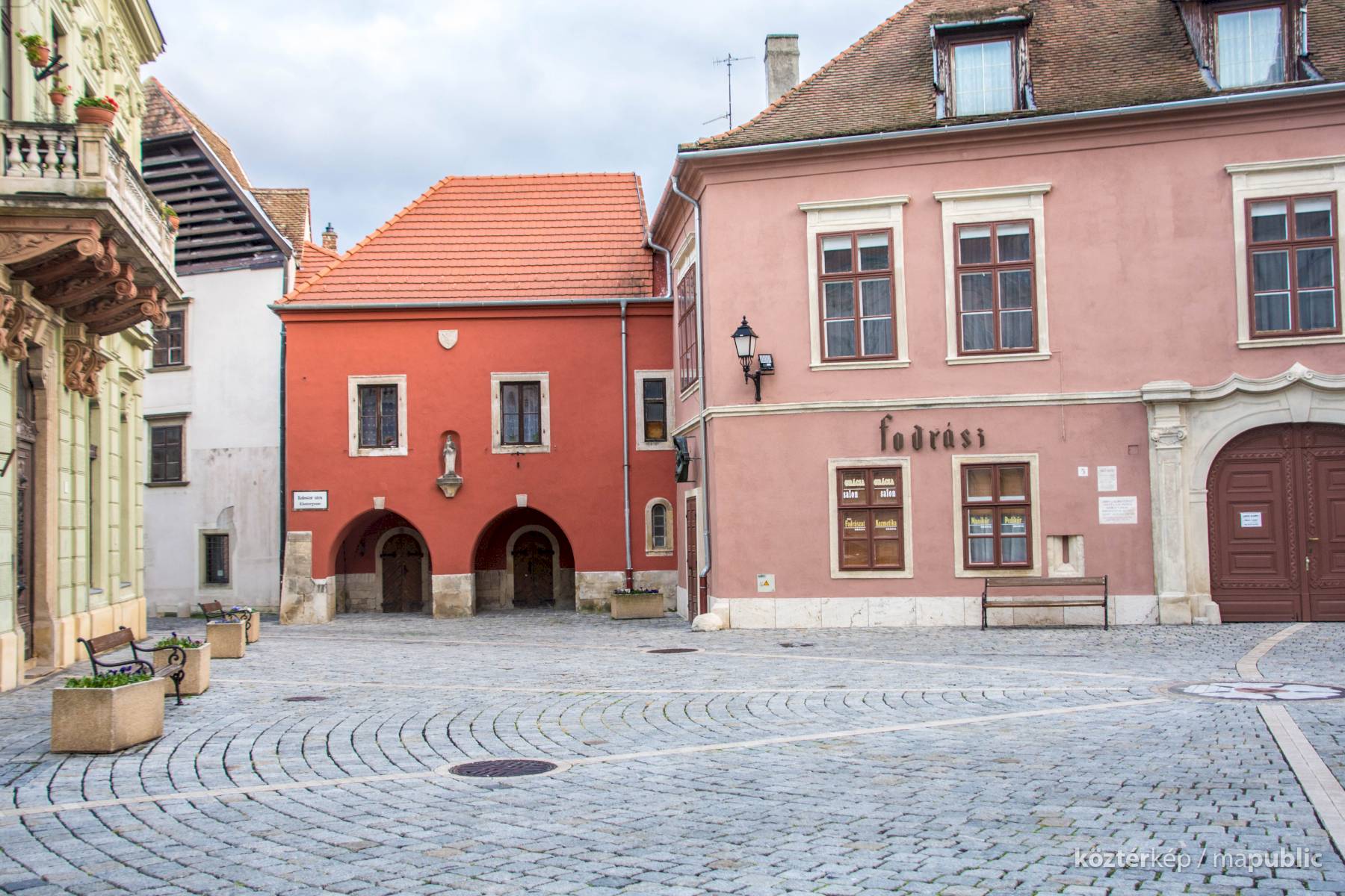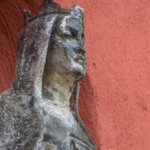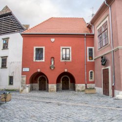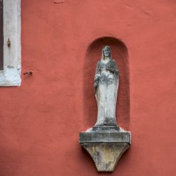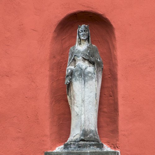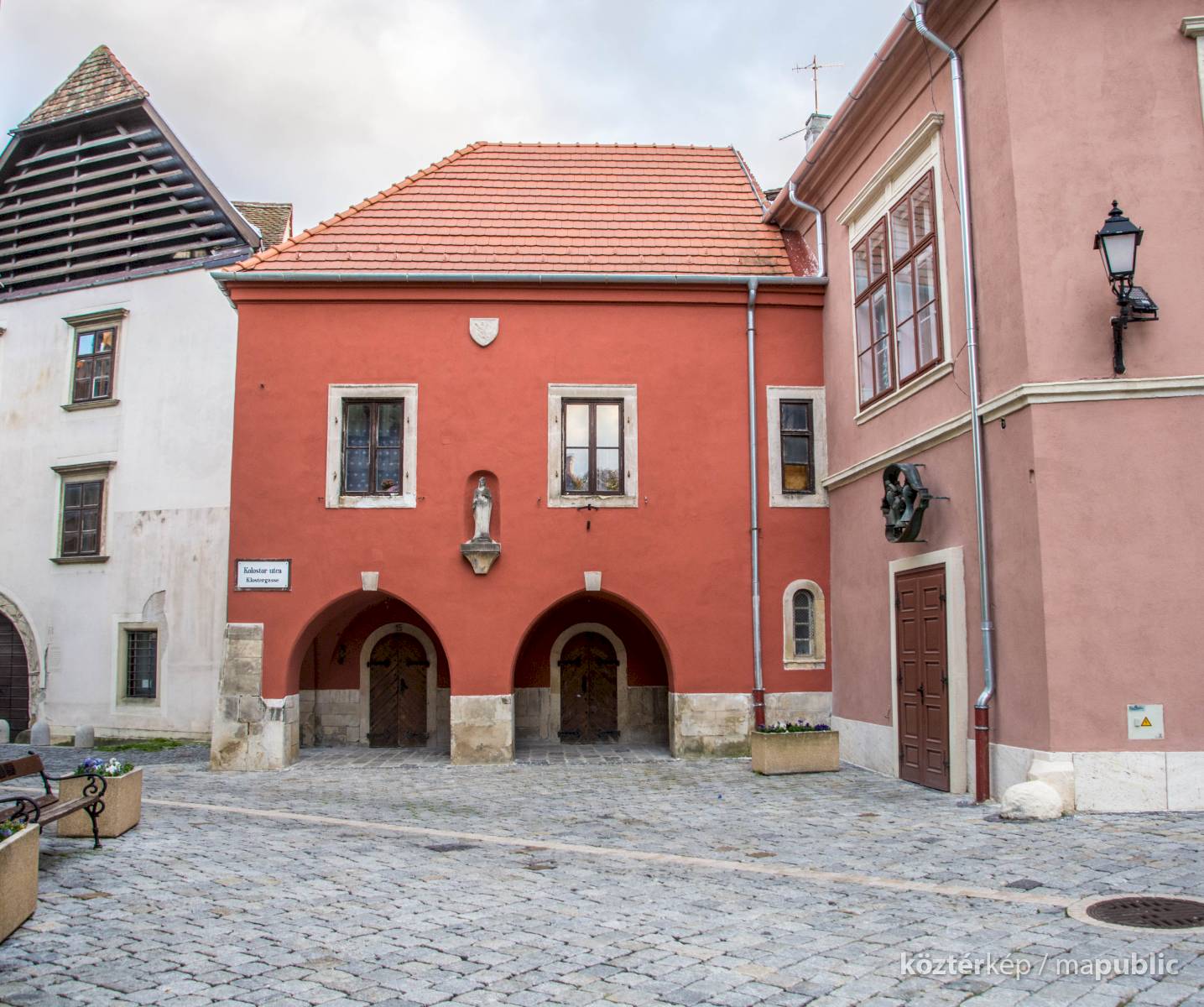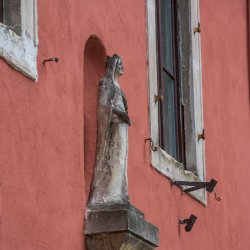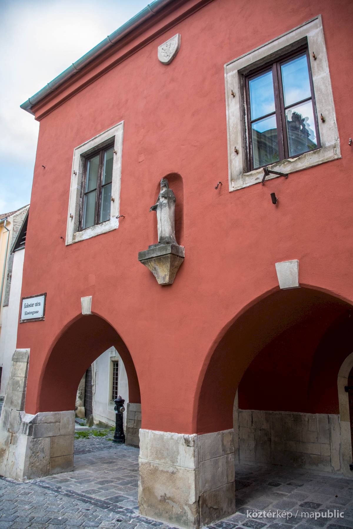 A ház homlokzati fülkéjében álló női alak koronát visel, kezében az alamizsnálkodás jelképeként kenyeret tart.