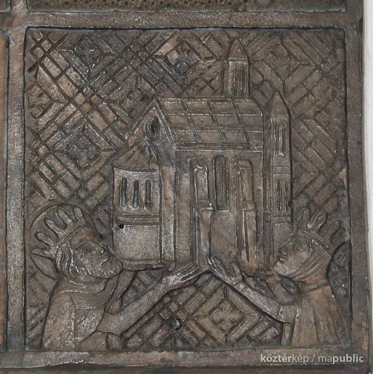 A relief közepén Szent István áll, teljes pompájában. Palástal a vállán koronával a fején bal kezében az országalmával jobbjában pásztorbottal, oldalán a STEPHANUS REX felirat olvasható. Felette egy angyal repül kisdeddel a kezében. Az anyal két oldalán tekervényes növényi díszítés látható. István karjainak magasságban egy egy páva áll tulipános virágmutívumokkal és indákkal díszítve, a koronázási palást motívumainak részletére utalva. [1] Lábánál hasonló díszítés madár nélkül, és alul Szent István jelképe monogramjának nyomata, mely a pannonhalmi kiváltságlevélen látható. Két sarkában szimbólikus domborművek láthatók: a korona felajánlása, Mária és a Kis Jézus alakja. [2](Alkotói szignó) A másik oldalon az egyház alapítás motívuma: Gizella és István egy templomot (Székésfehérvár bazilika) tart a kezében, melynek eredetije forrása a Szent István Király Múzeum Üvegnegatív Gyűjteményében látható.[3]