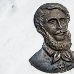 Kossuth portréja és Hédervár címere díszíti, gombszerű Kossuth-címeres csavarok tartják a márványtáblát.