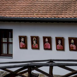 A falapokra faragott és festett arcképek az egyik épület (Rendezvényház) külső homlokzatát díszítik.