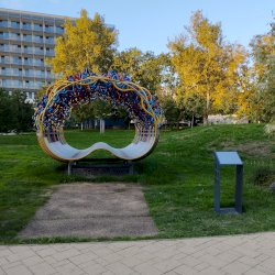 Az avatásról a feltöltési ötletek fórumban értesültem, mert elfelejtkeztem róla. A fotózást már a múlt hét óta tervezgettem. Aztán esett az eső, sár volt. Most, egyik este végre eljutottam az egyetem nyitott parkjába, ahhol könnyen megtaláltam a művet. A park bejárata a Kürt utca felől van, a sorompóknál kell bemenni, aztán az épület mellett jobbra. Az emlékművet már messziről látni, elég nagy.