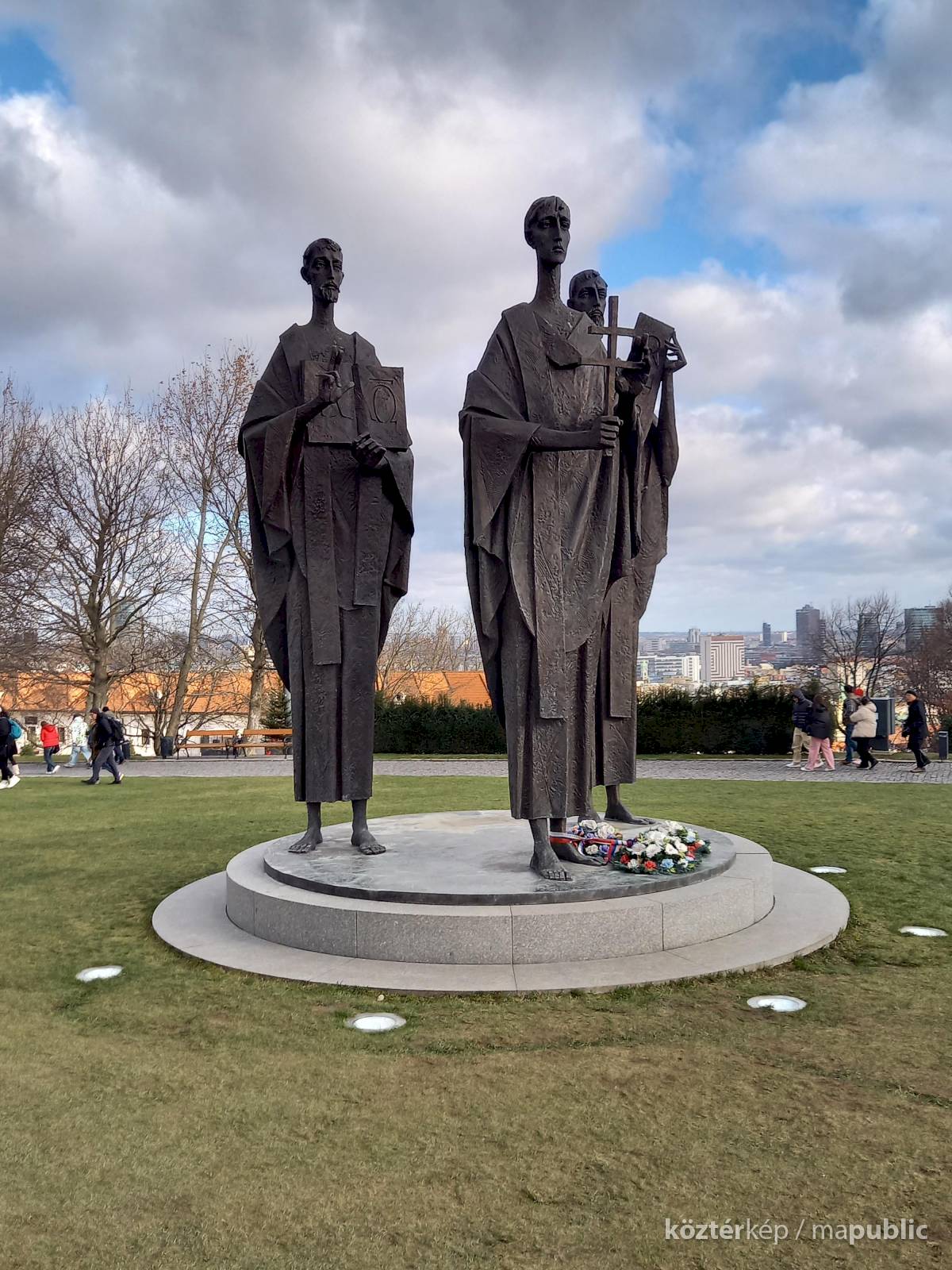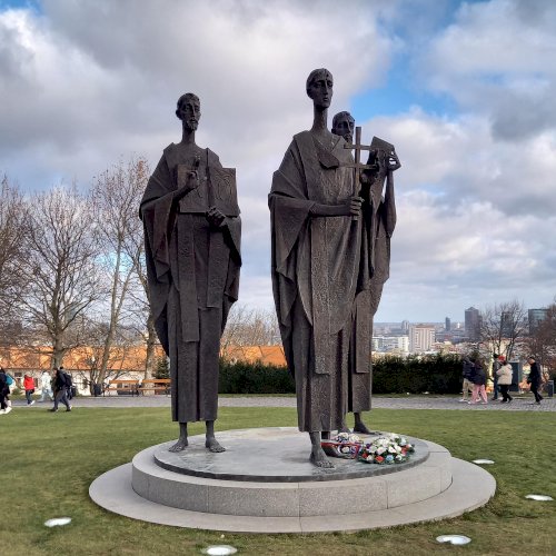 Nem adtam fel, végül a jobb oldali hátsó "figura" vezetett nyomra, ugyanis a vállán lévő stólán vagy papiruszon cirill betűket fedeztem fel. Márpedig a cirill írás létrehozását hagyományosan Szent Cirillnek[1] és Szent Metódnak[2] tulajdonítják. Ekkor már tudtam, hogy a testvérpárt látom, de ki lehet a harmadik? A két hátsó alakot idősebbnek ábrázolta a szobrász, arcvonásuk nagyon hasonló, látszik, hogy fivérek. Kis kutakodás után bukkantam rá egy tanulmányra, ami választ adott a kérdésre[3]. Az elől álló fiatalember kereszttel a kezében Gorazd, Cirill és Metód tanítványa.