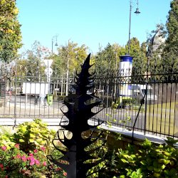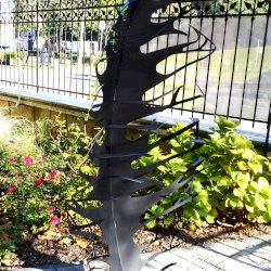 Rögtön a kapunál két Szirmai-alkotás várta a látogatót, kontrasztos színválasztással. Egyik a talán jobban ismert piros, másik mélyfekete: a Levél. Előnyös hely, hiszen már kívűlről láthatók voltak, másrészt a fotózást erősen akadályozta a környzet, az utcai forgalom, minden, ami a kerítésen átütött, más oldalról az épület, lépcső... Szóval jobban érvényesültek szabad téren.