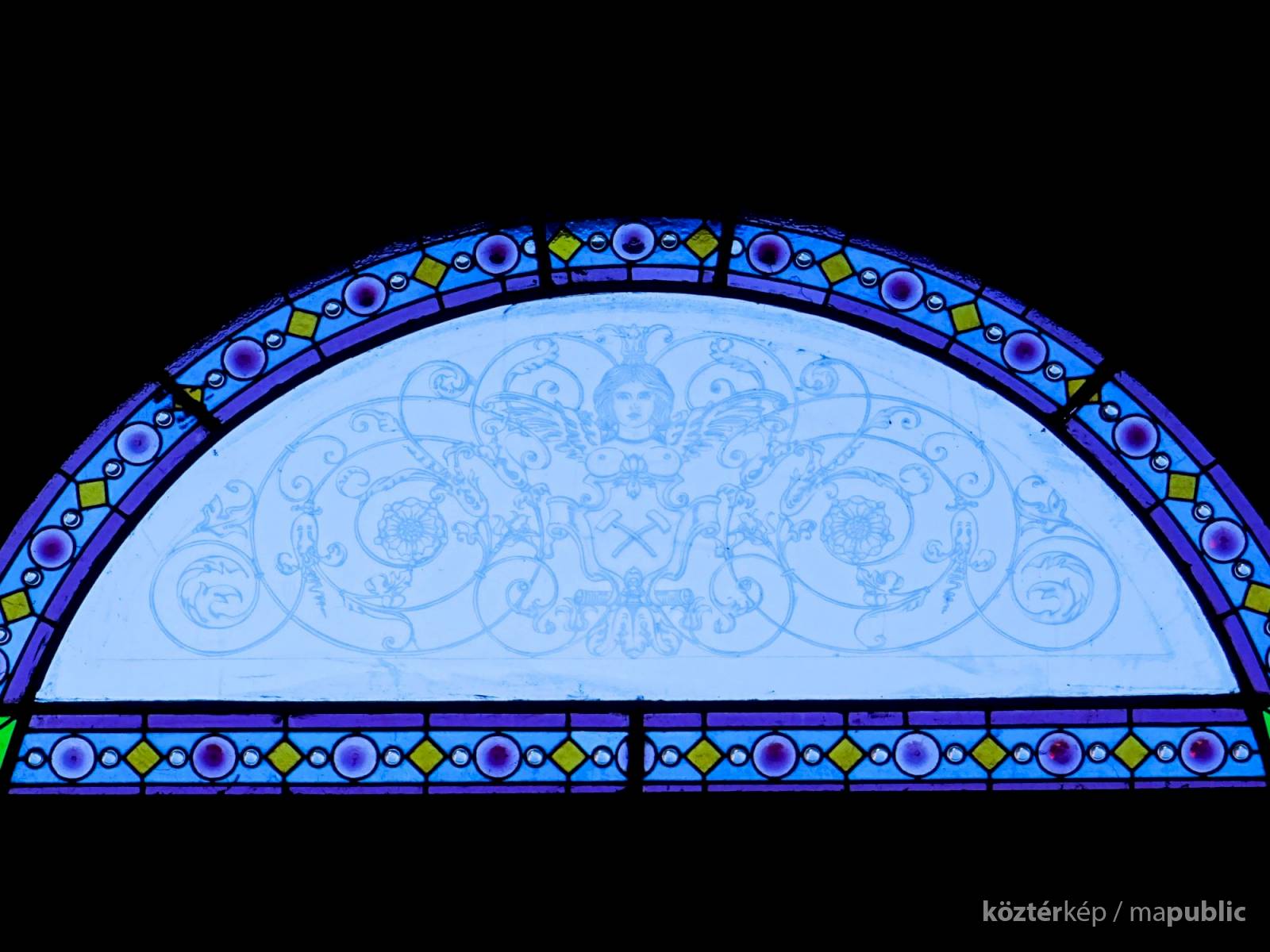 A napokban arra jártam és ki tudja miért, bekukucskáltam a díszítés mögötti üvegen. Így vettem észre, hogy a kapuval szemben egy pár színes szegélyű üvegablak viszi tovább a témát. A "bányász angyalok" más eszközzel újra megvalósultak. Mint egy színes keretes, "fehér árnyék" néznek a bejárat befelé néző oldala felé. Az ablakok figurális része homokfúvásos technikával készült.