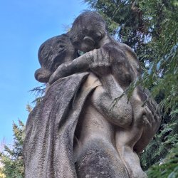 Mintha a szobrot benövő tuják elől bújna a gyermek az édesanyjához, nagyon kedves pillanatot láthatunk.