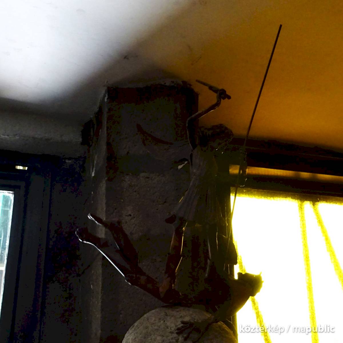 Beszélgetve a kedves hölggyel, aki segített bejutni a templomtérbe (bár ez a szobor még a szabadon látogatható előtésben van), elmondta, hogy a szobrászművész a Farkasréti Templomot látogatja. Ennek alapján gondolom, adományként került a veszprémi szobor mini-változata ide és bizony érdekes érzés, hogy amint az ember belép az ajtón, a feje felett máris egy ilyen dráma zajlik.