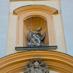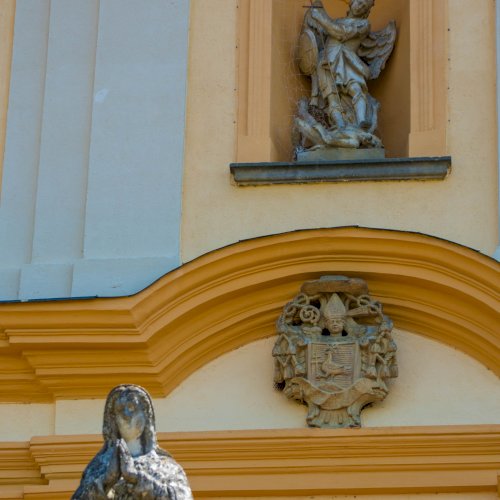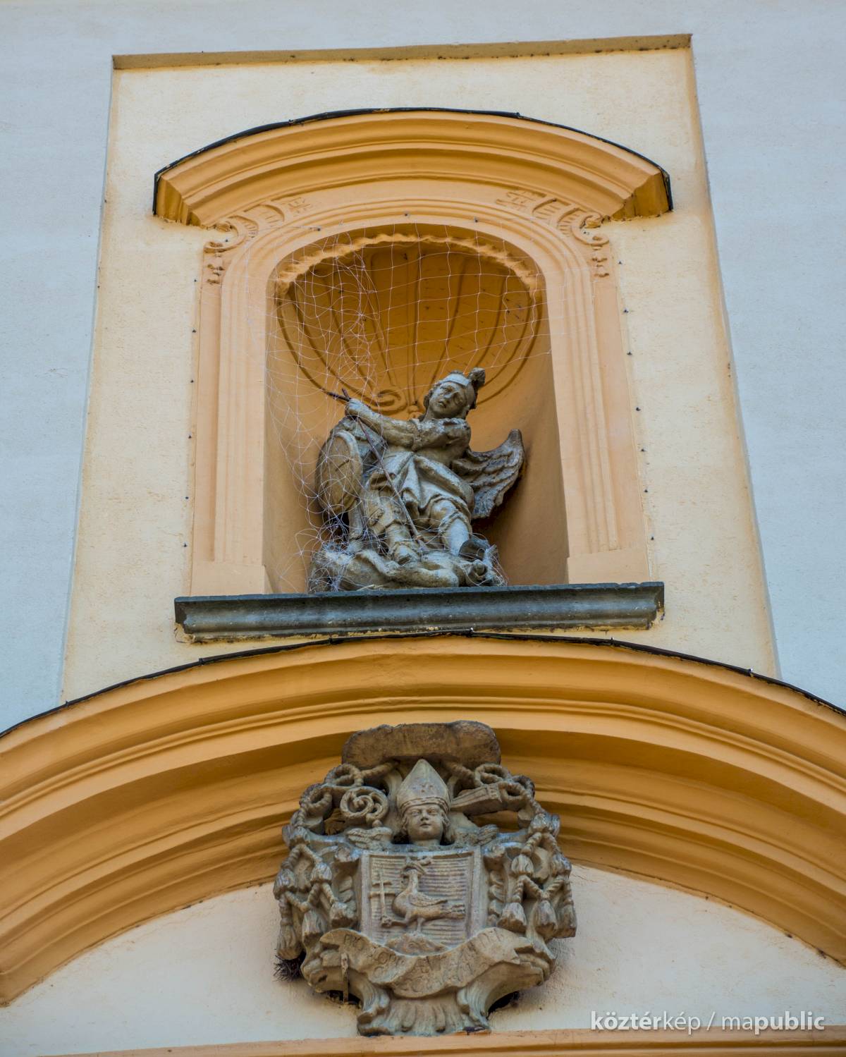 Szent Mihály szobra a torony alatt, Padányi Bíró Márton címere fölött, a templom központi tengelyébe épített fülkében áll.