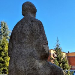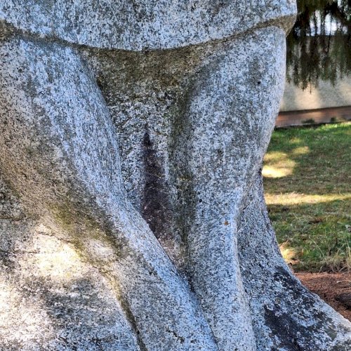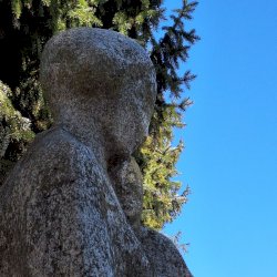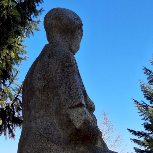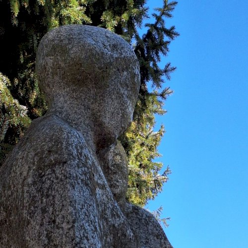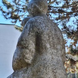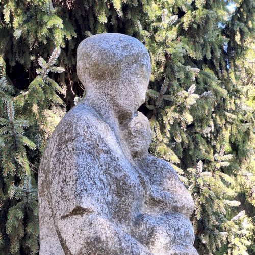 Örökzöld árnyékában van a szobor, nem fotózható körbe.