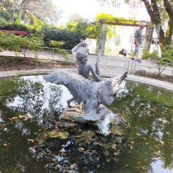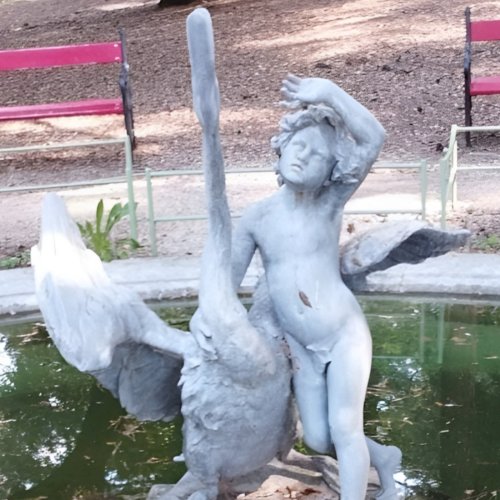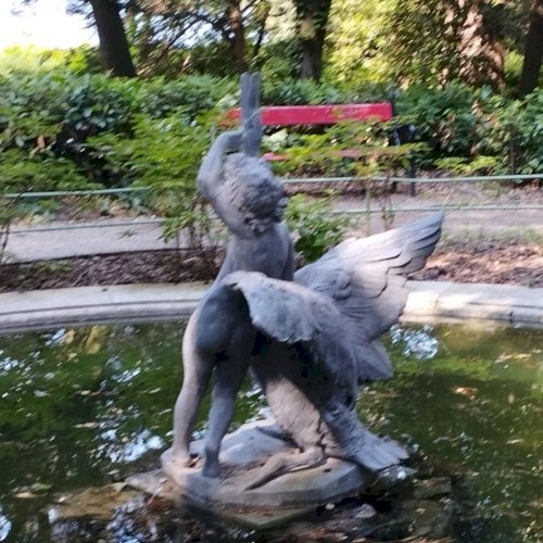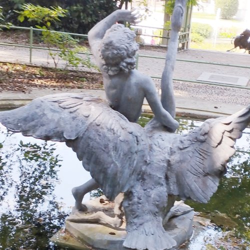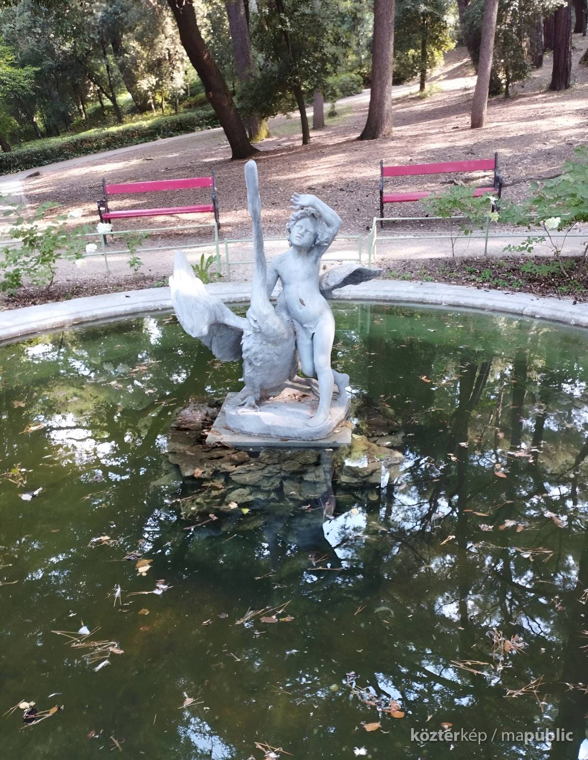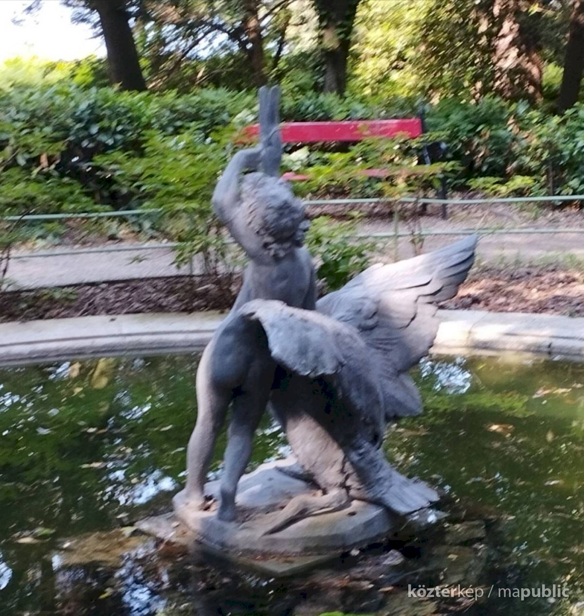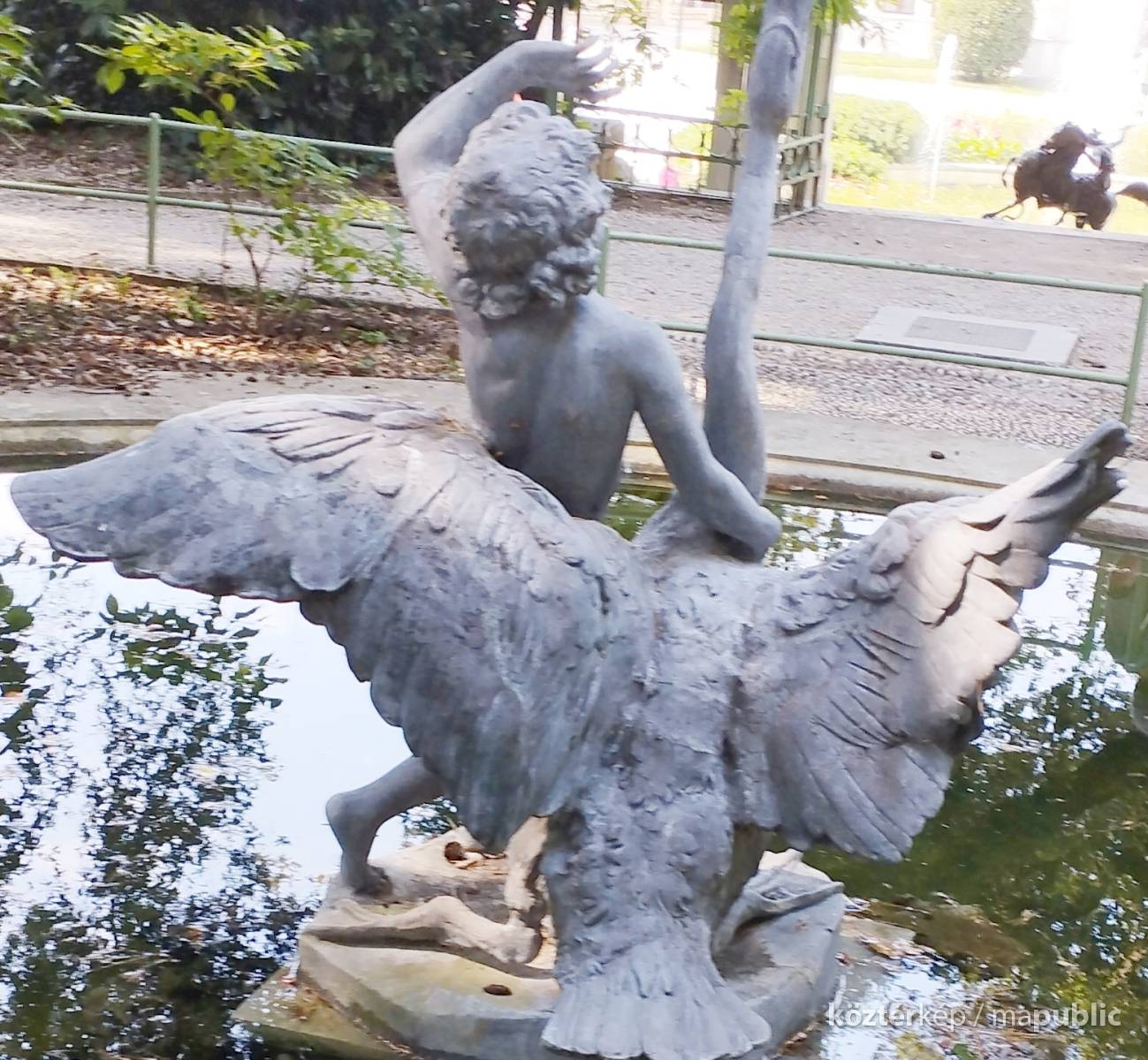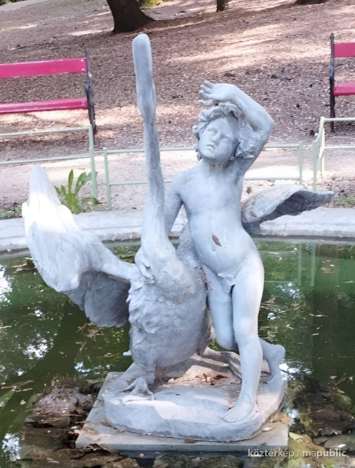A mű egy puttót, gyermekfigurát ábrázol egy hattyúval. Bronzból készült, patinás. A gyermek egyik kezével a hattyú nyakát fogja, másik kezét pedig a feje fölé emeli. A hattyú a nyakát kinyújtja, a csőre pedig tátva van. Valószínűleg a fiú a hattyúval játszik, ez mind az állaton, mind a gyermeken látszik. A szobor egy kis szökőkút közepén áll. A mű közelében található információs tábla szerint a hattyú csőréből víz csorog. Ez ottjártamkor nem működött, bár víz az bőven volt a kútban. Az alkotás viszonylag kicsi, kb. 1 méter magas.