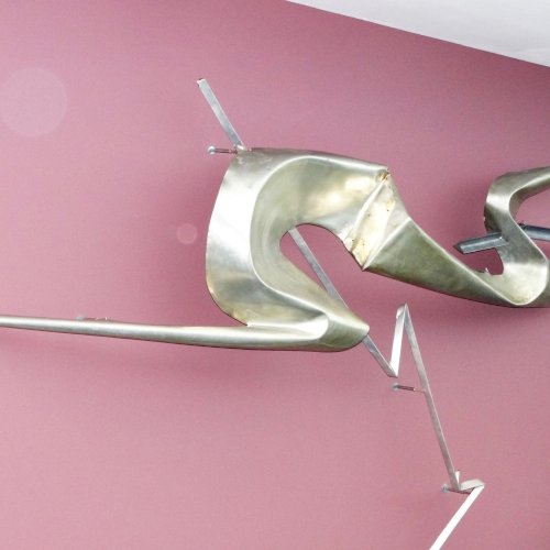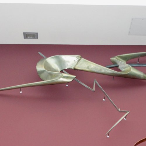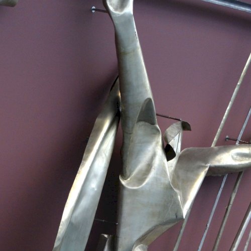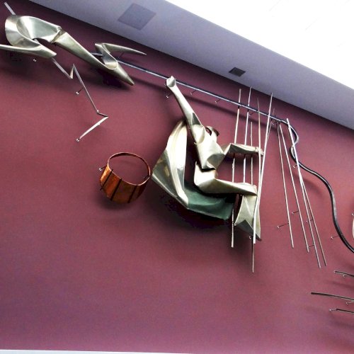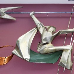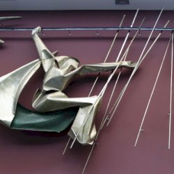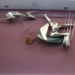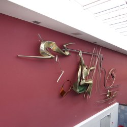 Az alkotás egy picit félreeső, de védett helyen van úgy, hogy itt mégis viszonylag sokan megfordulnak, így többen láthatják. Igaz, hogy környezete nagyot változott, a "feladat" más, de pl. érdekes háttérszínt kapott, ami valahogy modernizálja.