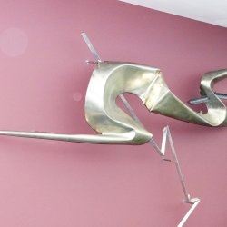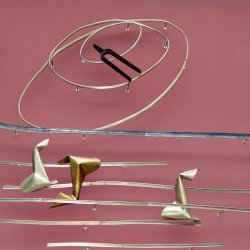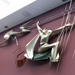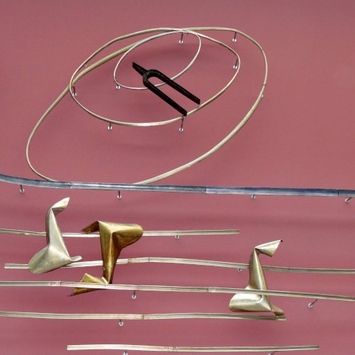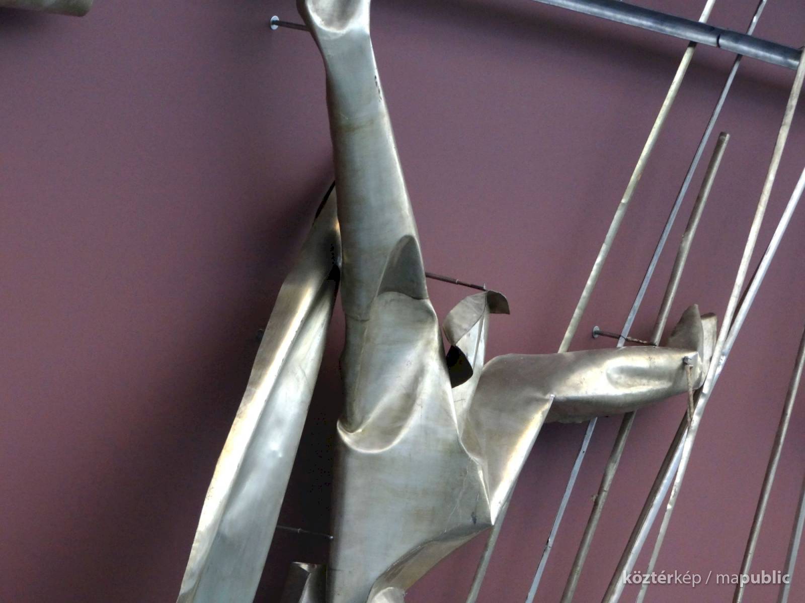 A korábbi leírásom él, bár kicsit korlátozott térben: "A középpontban a nőalak látható – mintha a zene hullámain lebegne, zenekari (stilizált) hárfát penget, a kép közepe felé fordul. A jobb alsó területen "a" kottát látom, amihez meg van az öt vonalas rendszer, rajta stilizált hangjegyek... amik viszont folyón úszkáló madarak is lehetnek. De ahogy a bal felső szélre nézek, más madarak (darvak?) szállnak nagy lendülettel. Mindezt behálózzák az alkotás anyagából készült szálak és gomolyagok. A kép egésze a jobbszél felé terjeszkedik, a madarak a másik oldal felé húzzák a kompozíciót és a néző figyelmét."