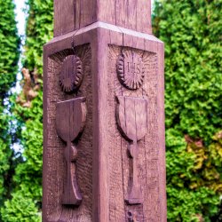 Szobrait, alkotásait erdélyi fafaragók készítették.[1]