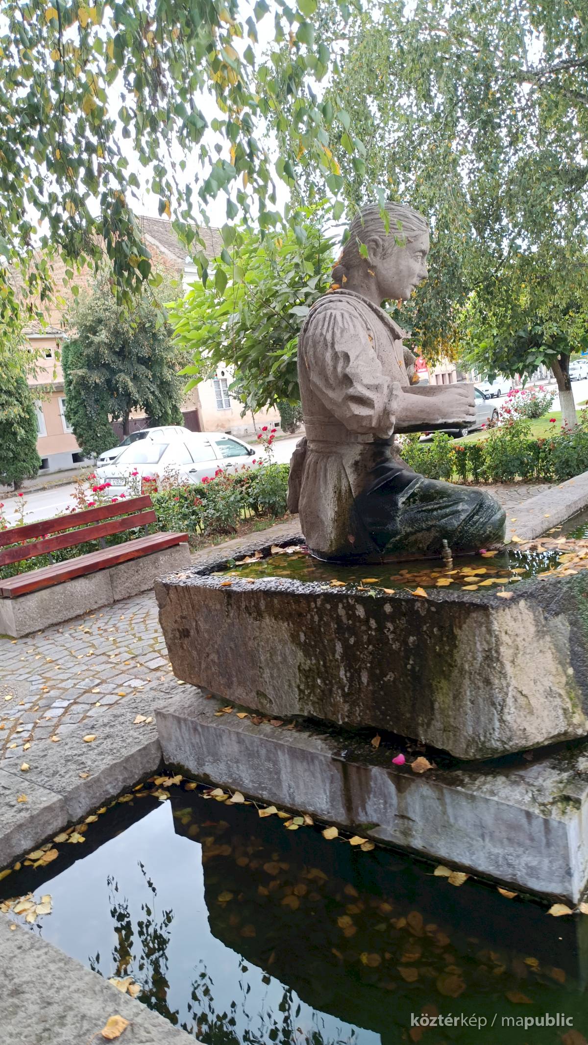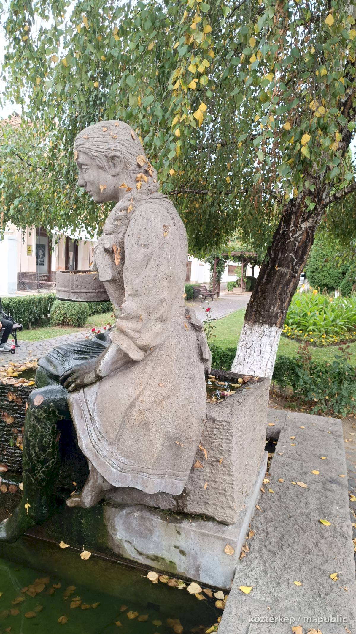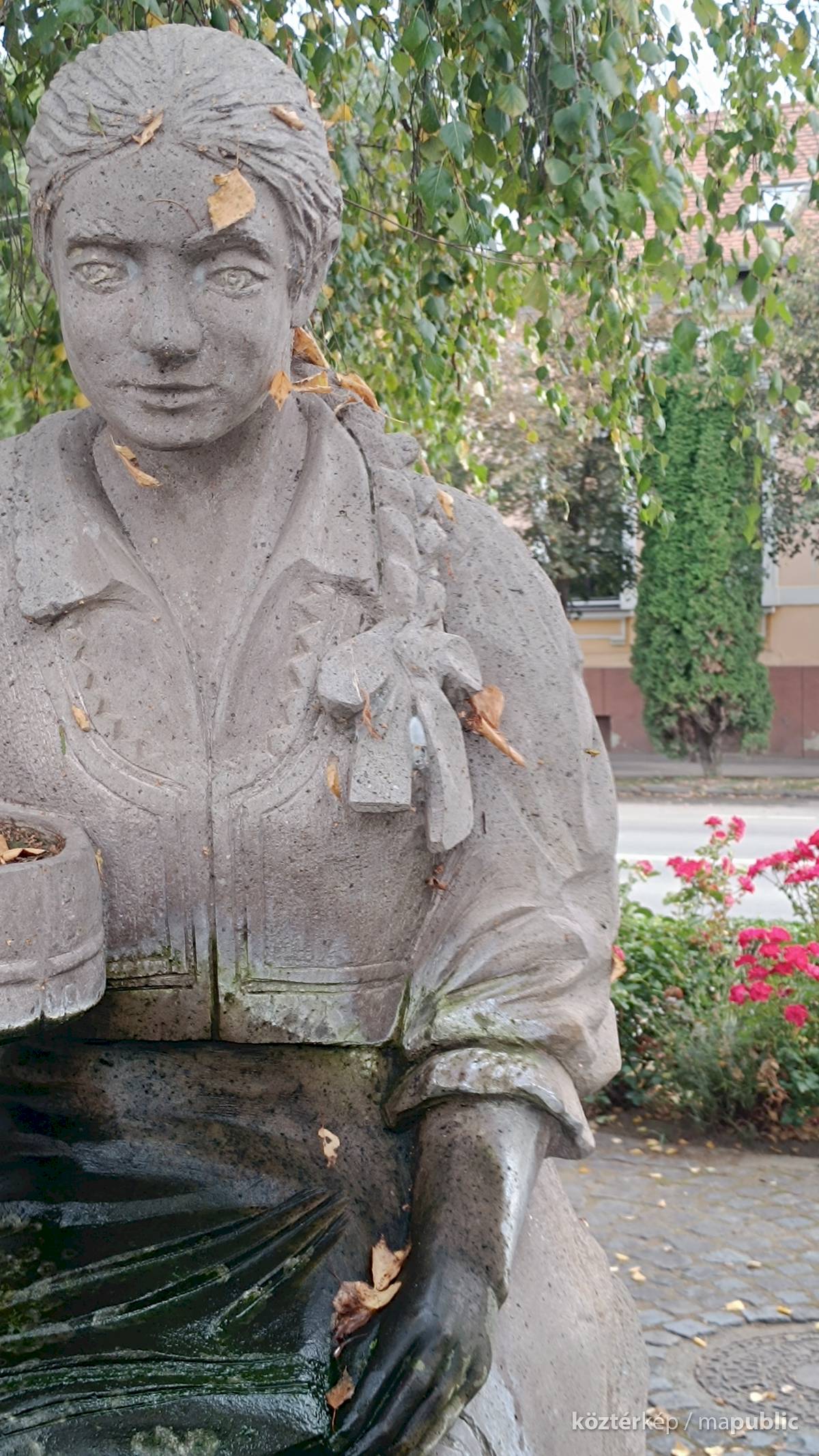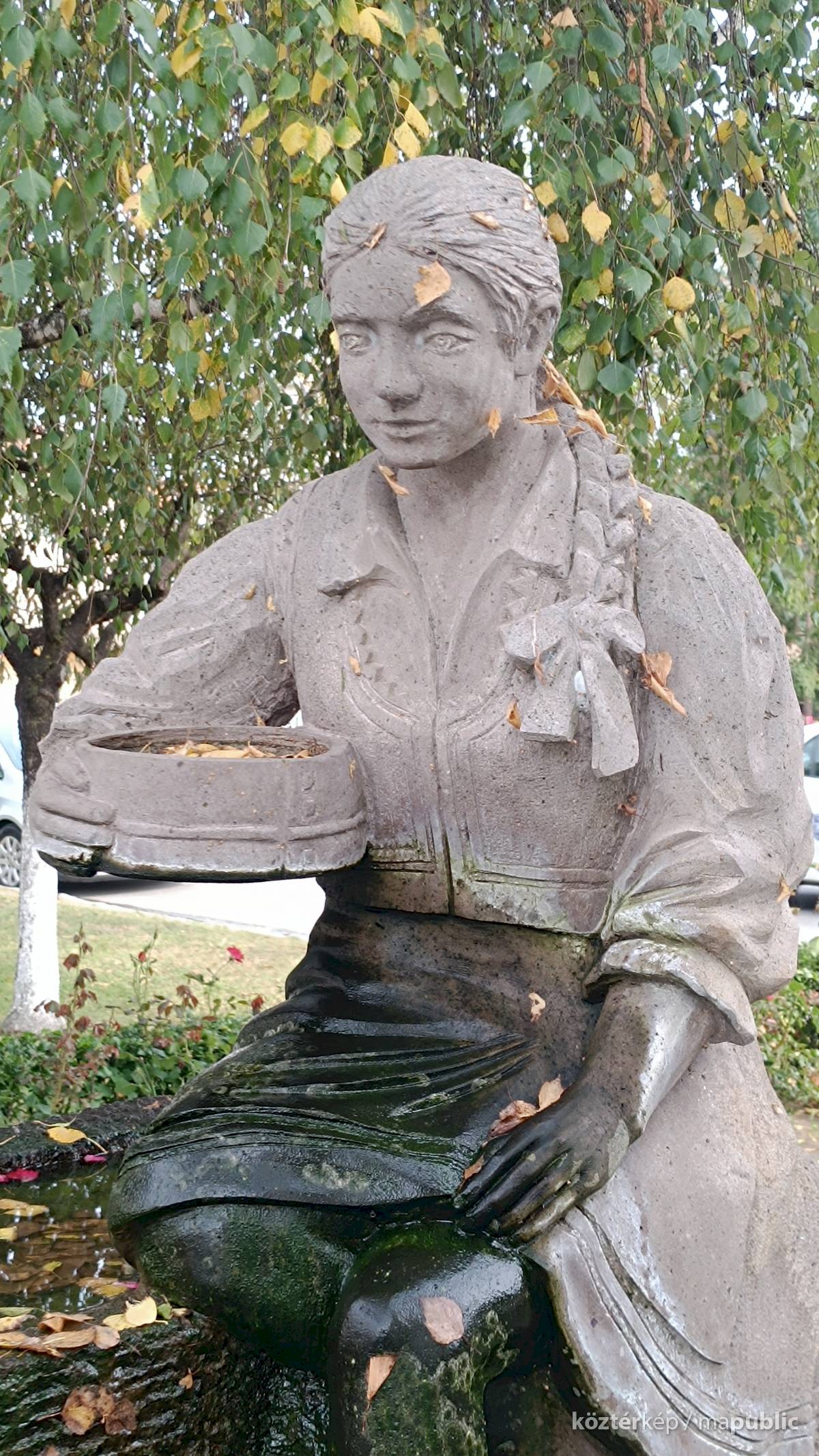 A szögletes kútmedence szélén ül a népviseletbe öltözött székely leány, jobb kezében a hajlított fakeretű szitával. Mindkét lábát a vízbe meríti, haja hosszú fonatban, szalaggal díszítve lóg a vállán. Szép jelképe a kitartásnak, türelemnek a kézimunkának. A leány szoknyája és lába elszineződött a víztől, de ettől függetlenül szép munka. Alkotói szignót nem találtam rajta.