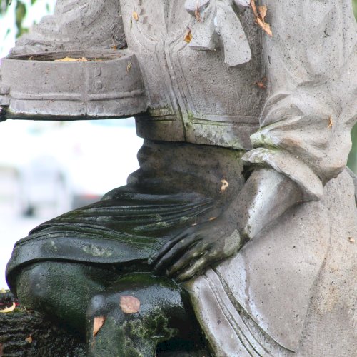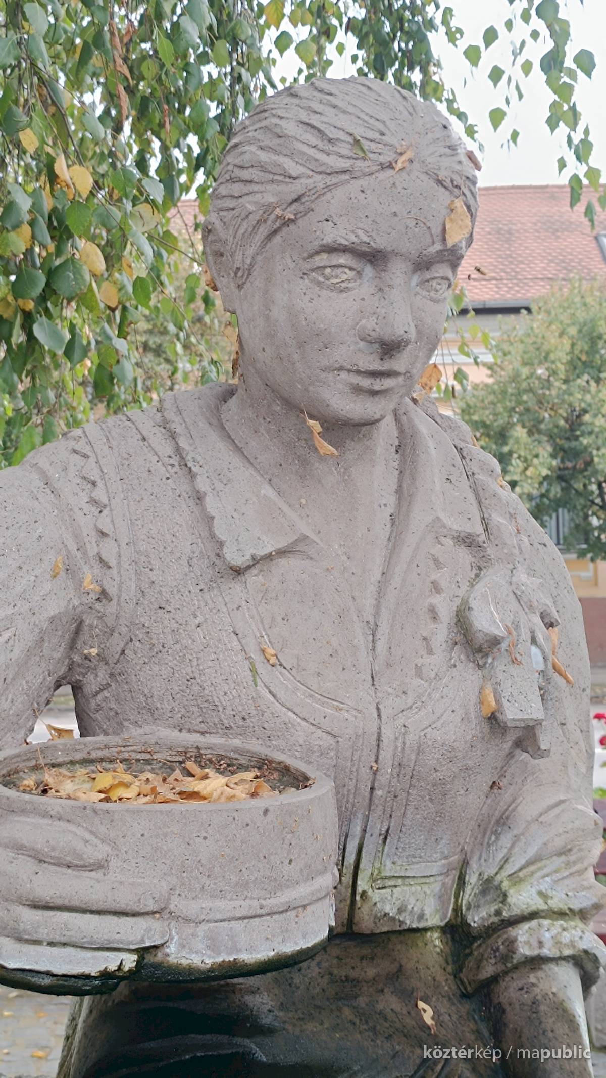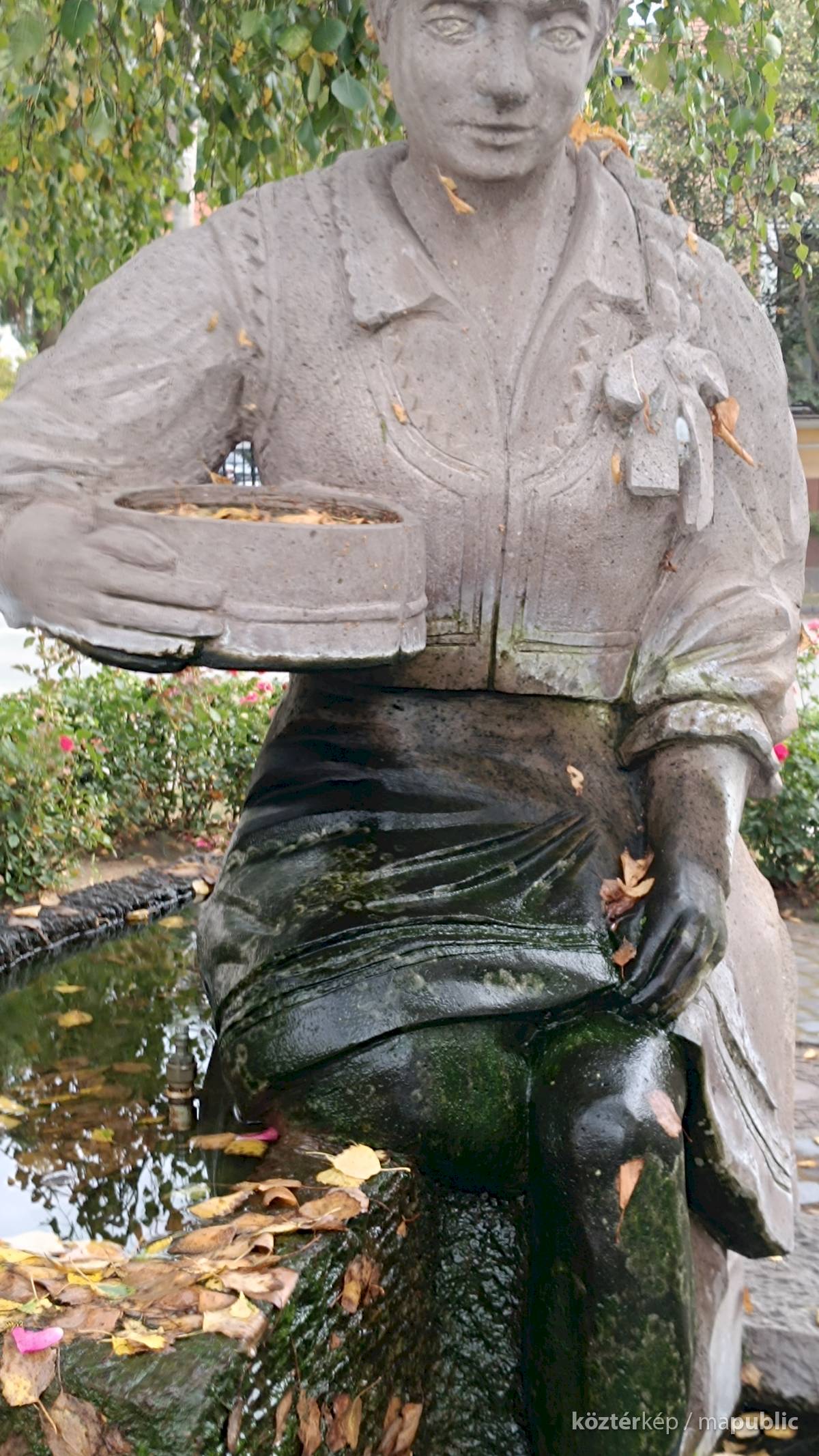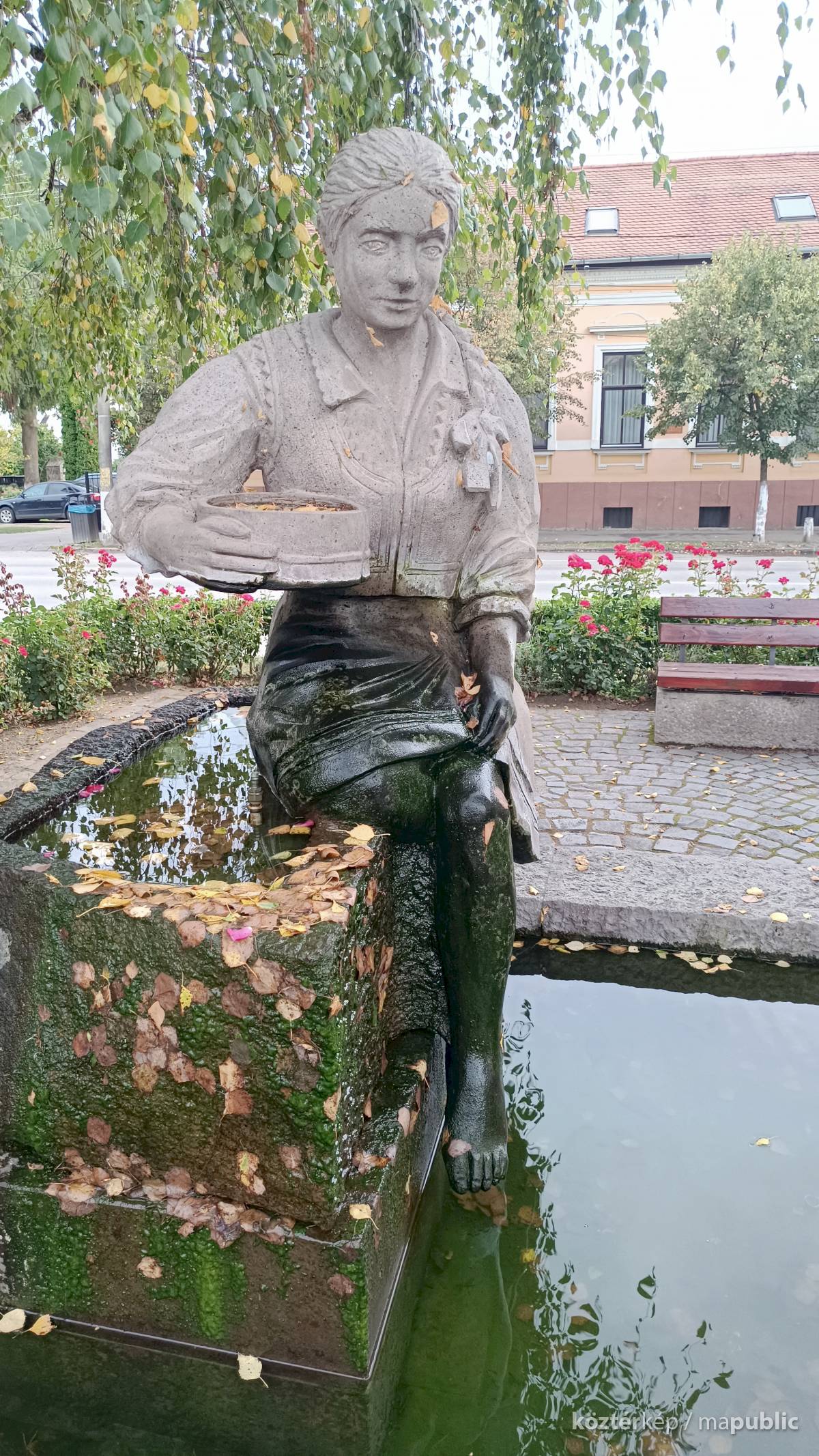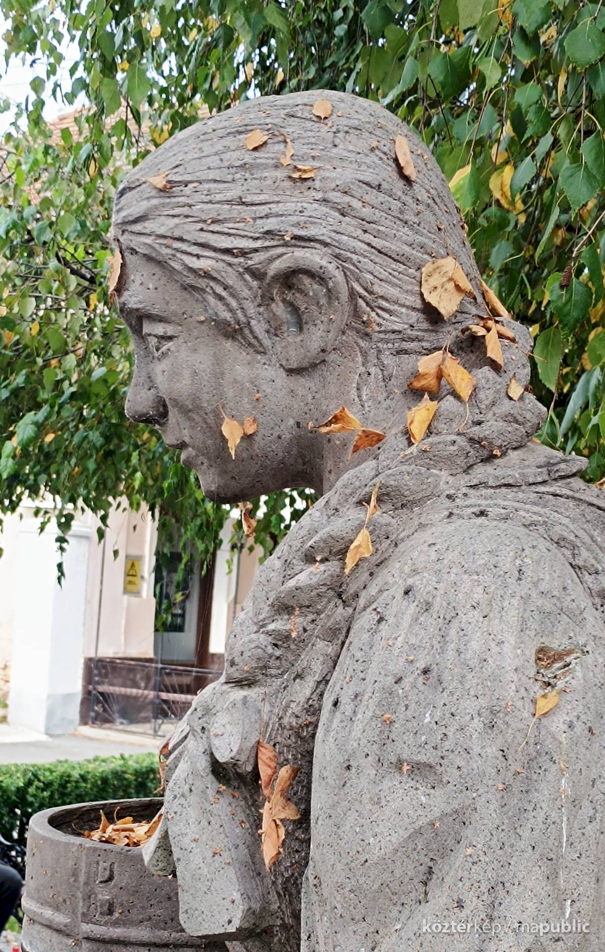 A szögletes kútmedence szélén ül a népviseletbe öltözött székely leány, jobb kezében a hajlított fakeretű szitával. Mindkét lábát a vízbe meríti, haja hosszú fonatban, szalaggal díszítve lóg a vállán. Szép jelképe a kitartásnak, türelemnek a kézimunkának. A leány szoknyája és lába elszineződött a víztől, de ettől függetlenül szép munka. Alkotói szignót nem találtam rajta.