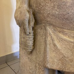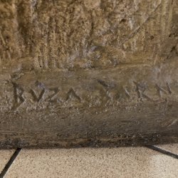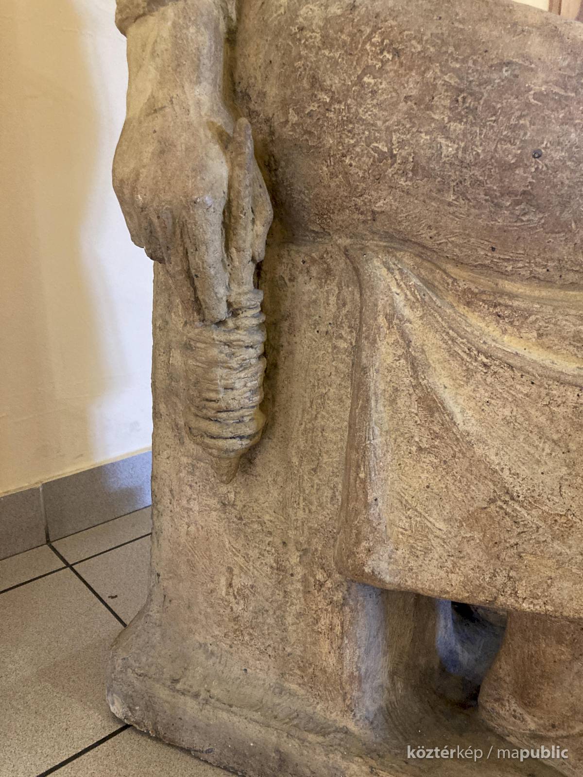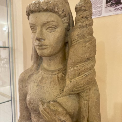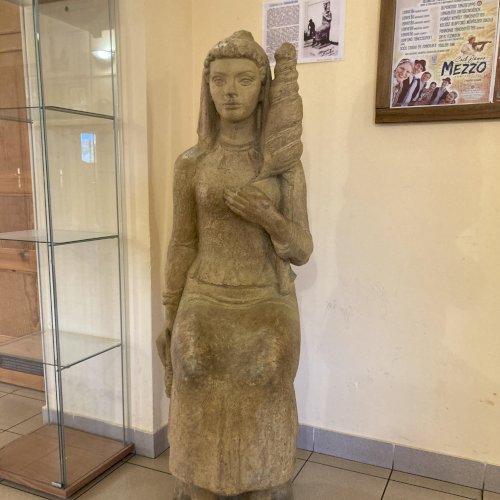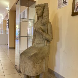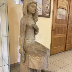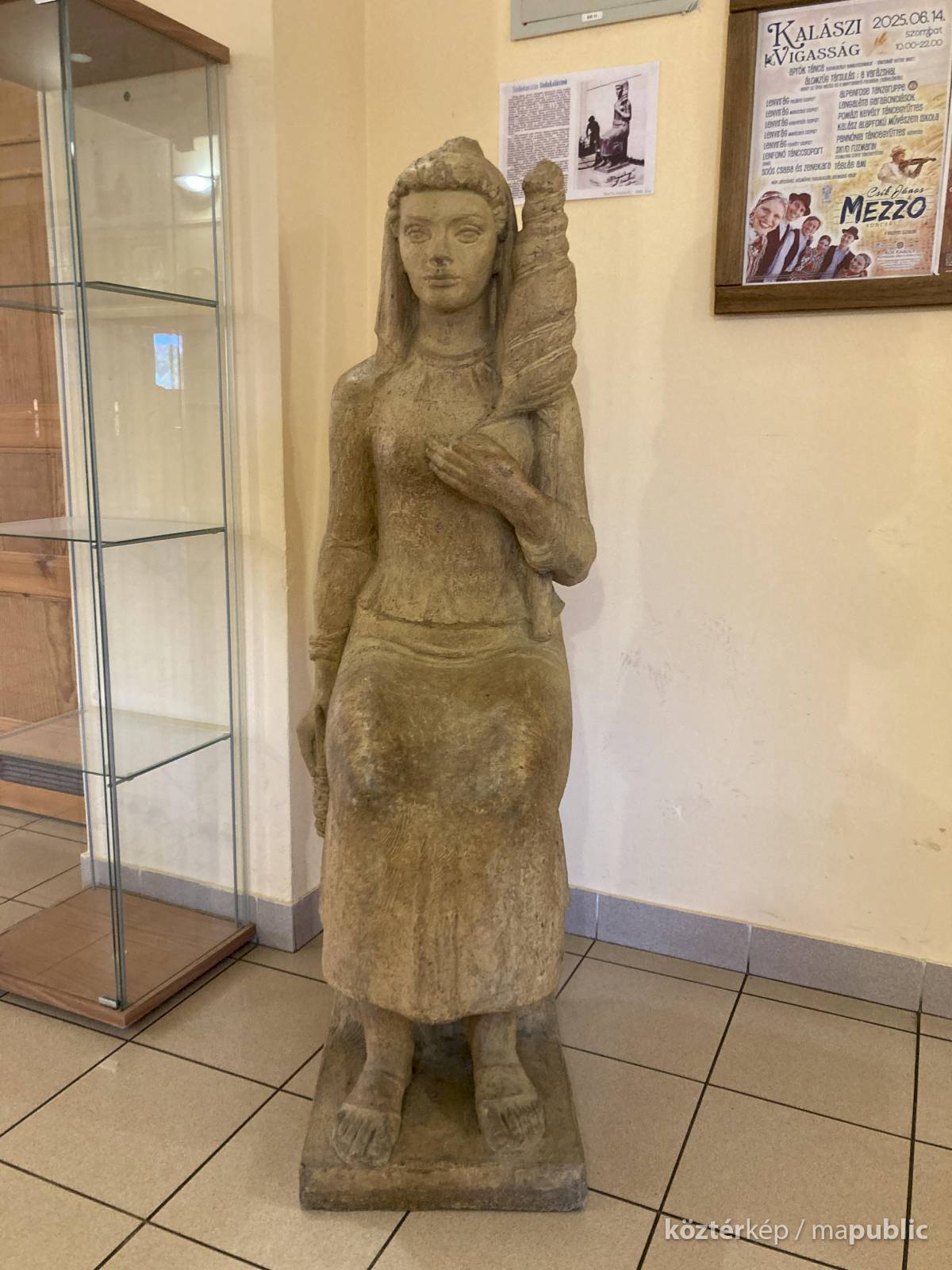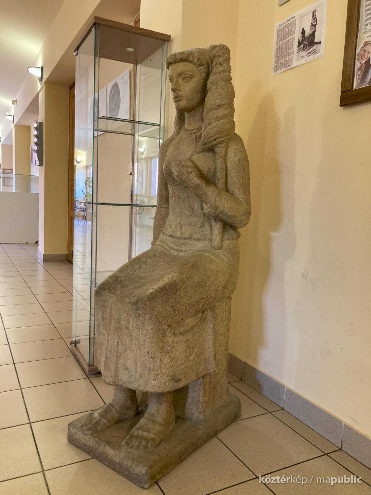 Az ülő női textilmunkást ábrázoló szobor pirogránitból készült, elkészítésével a budakalászi Lenfonó és Szövőipari Vállalat bízta meg a neves szobrászművészt. Eredetileg a művelődési ház szinte közvetlen szomszédságában álló gyár bejáratában került elhelyezésre és 1982. április 30-án avatták fel.[1] A gyár bezárását követően - pontos évszámra vonatkozó információk nem állnak rendelkezésemre - valamikor a művelődési házba került, jelenleg az emeleti folyóson látható, igaz itt már a kő talapzat és felirat nélkül. Az avatással kapcsolatos további információk a kapcsolt (előzmény) műlapon olvashatóak.