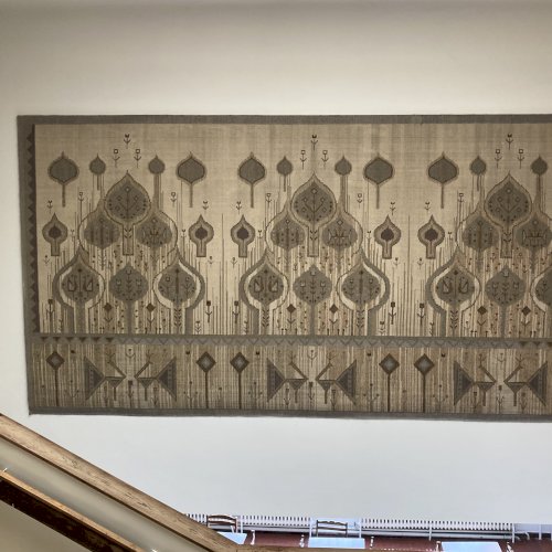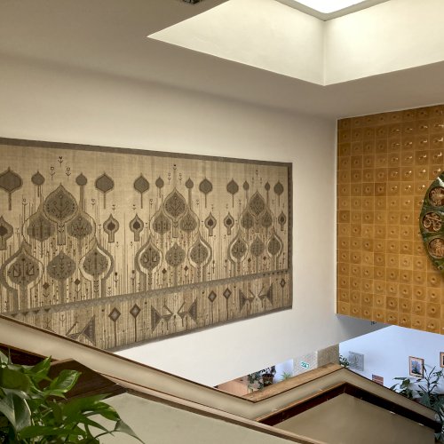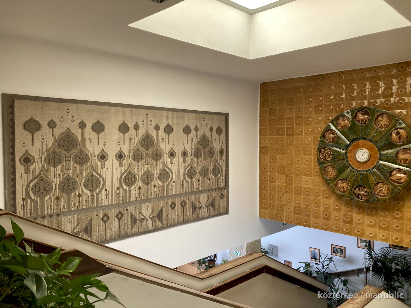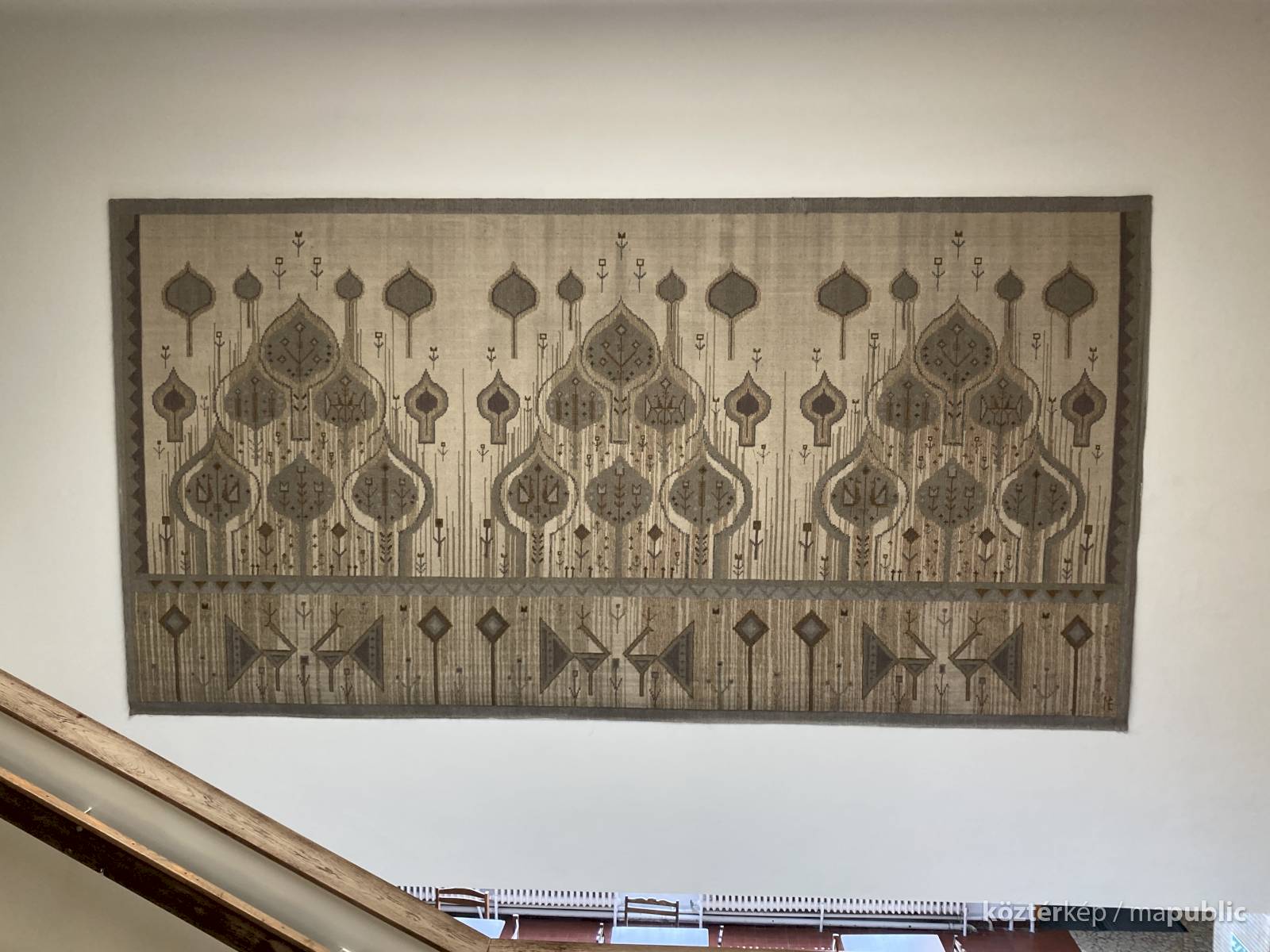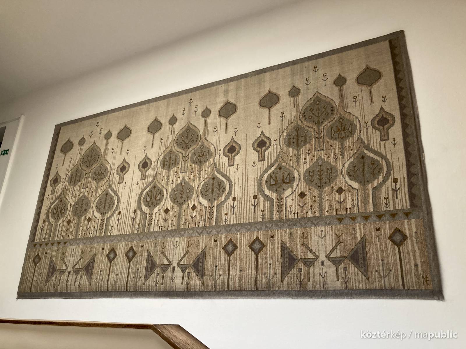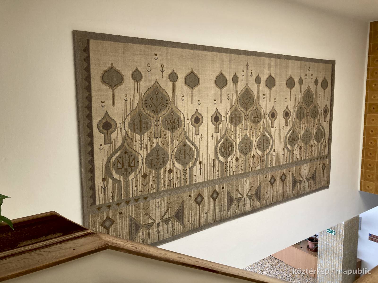 Mezőberényi faliszőnyege, mely a művelődési ház lépcsőfeljárójában található (merőlegesen Takács Győző kerámiafala mellett) jól példázza a fentebb leírtakat. A függőleges ritmusban ismétlődő csúcsos, kupolaszerű motívumok stilizált növényi, az alsó sávban állati (madár) formákat idéznek, melyek egyszerre utalnak a népi díszítőművészet világára és a keleties ornamentika hatására is.