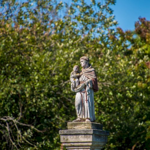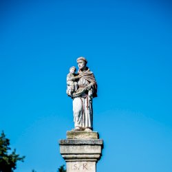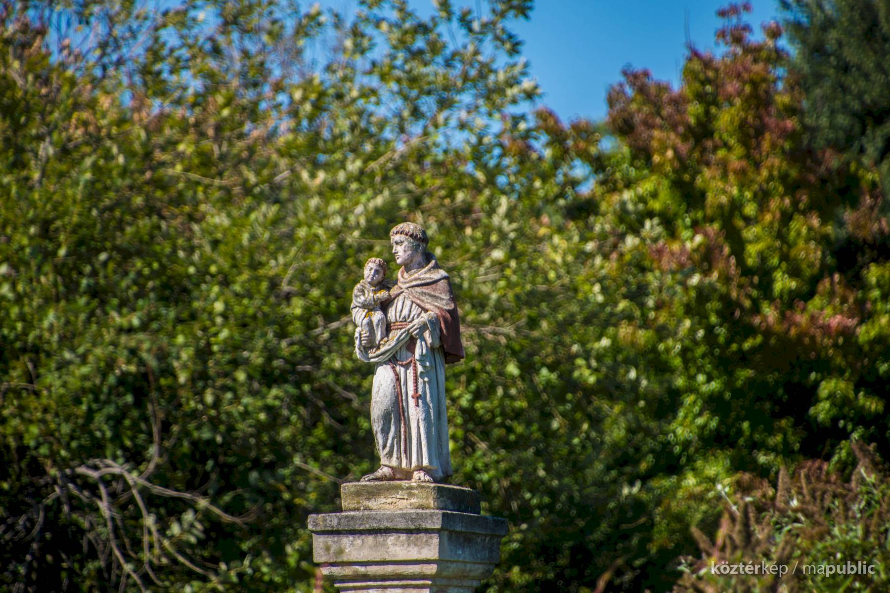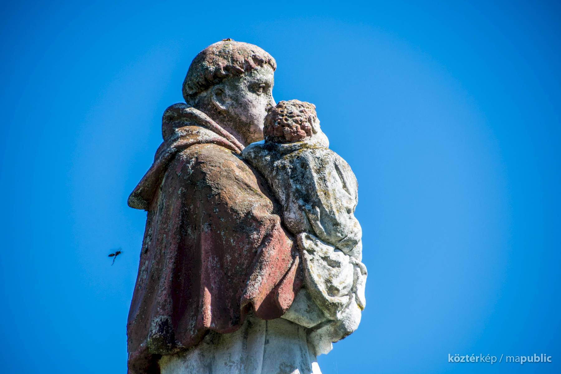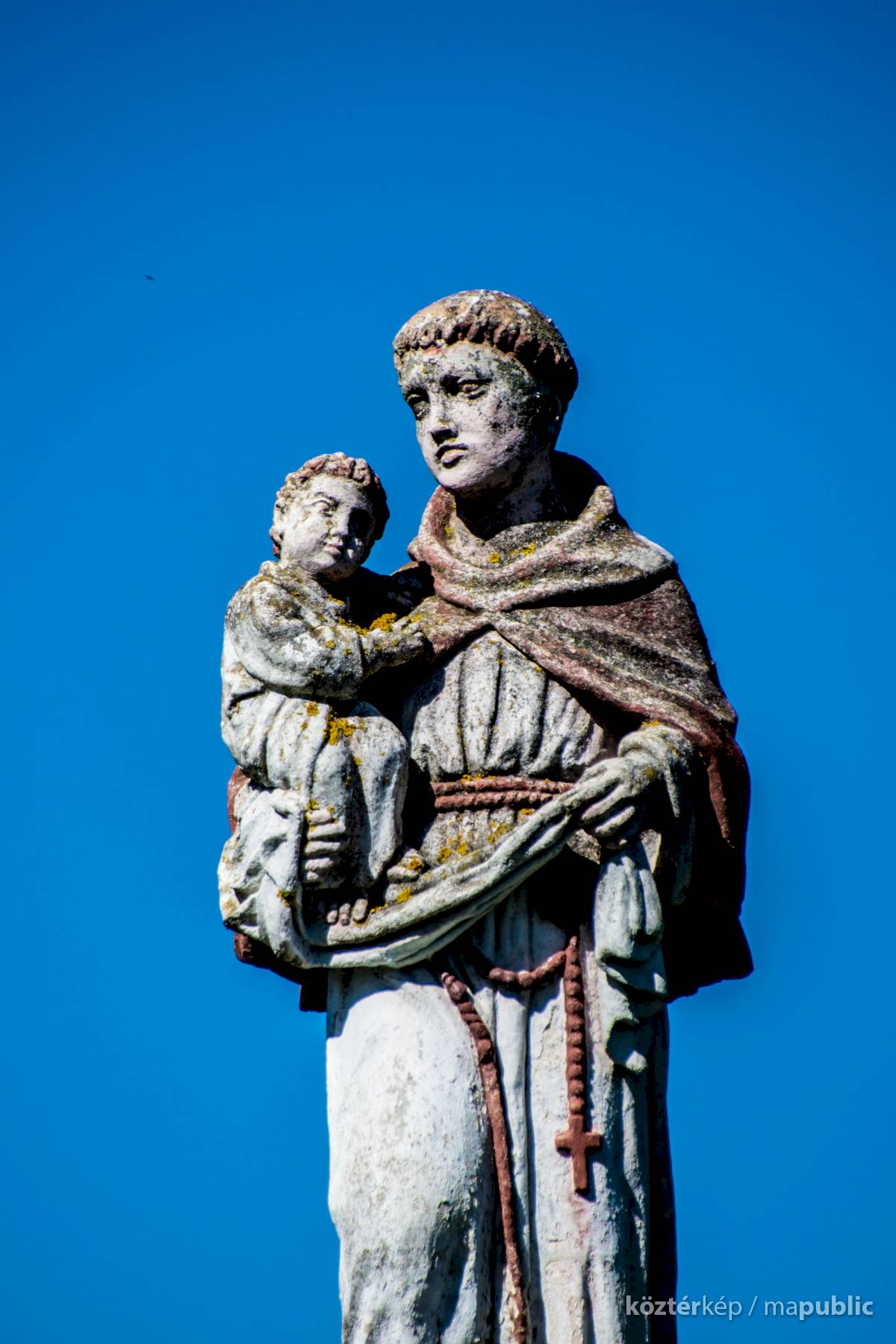Szent Antalt szerzetesi ruhában, csuháját összefogó kordával-, karján a gyermek Jézussal látjuk, amely a Szent attribútuma.