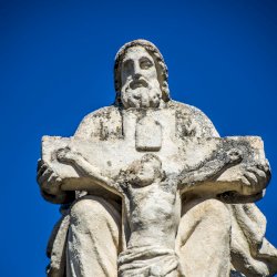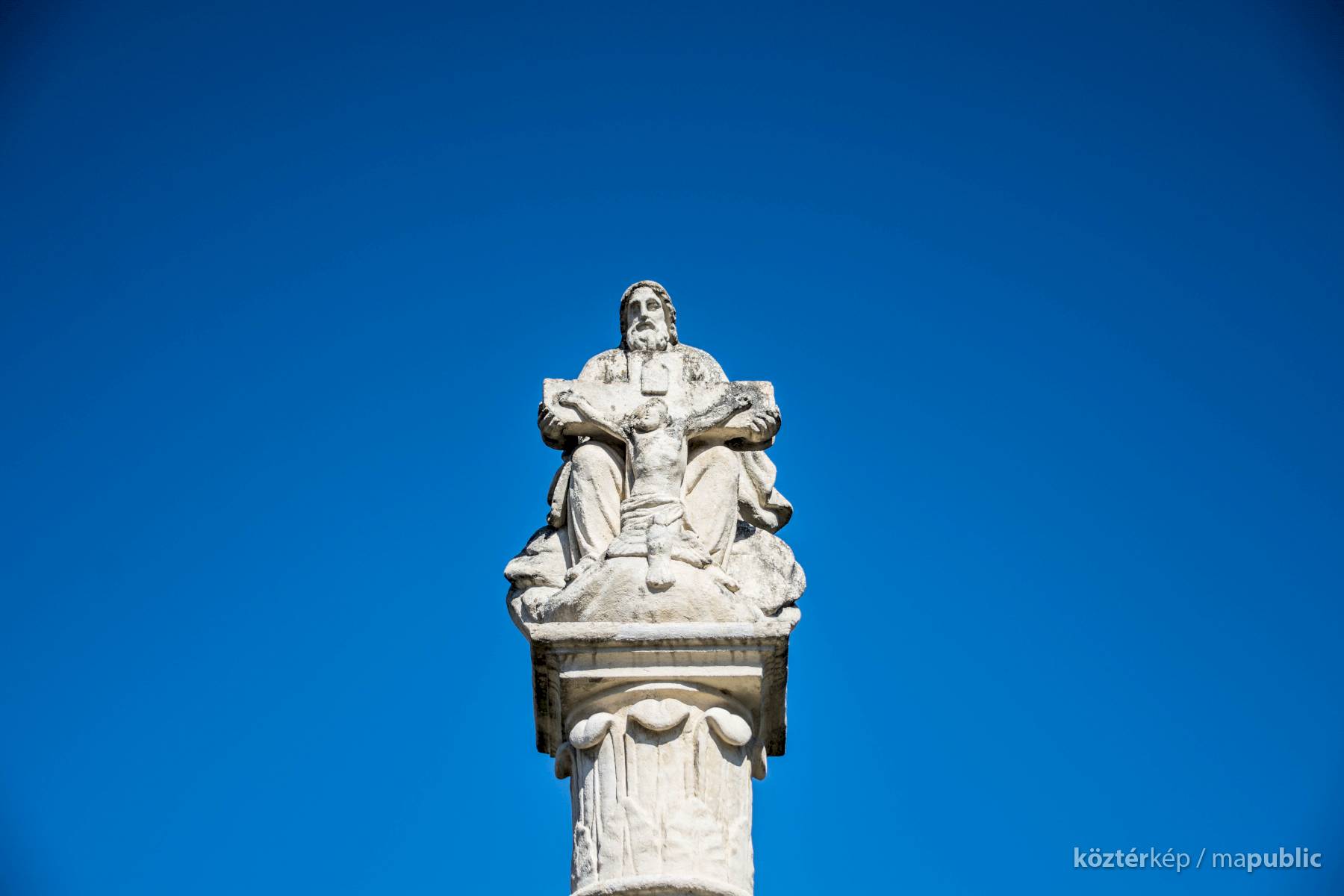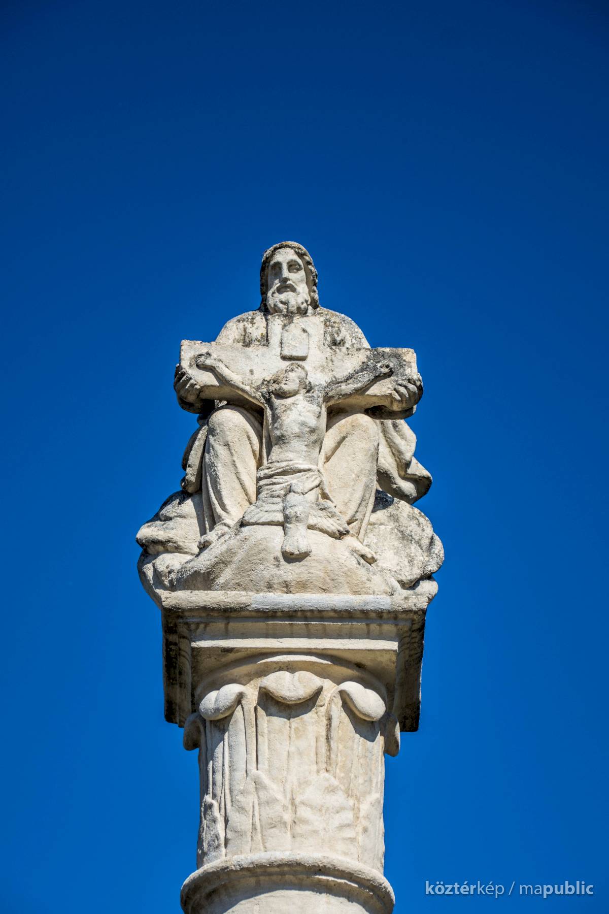 Az Atya kezében tartja a kereszten függő egyszülött fiát, a világot megváltó megfeszített Krisztust. Az égből alászálló Szentlelket kiterjesztett szárnyú galamb képében látjuk.