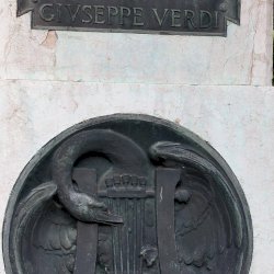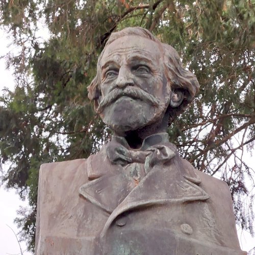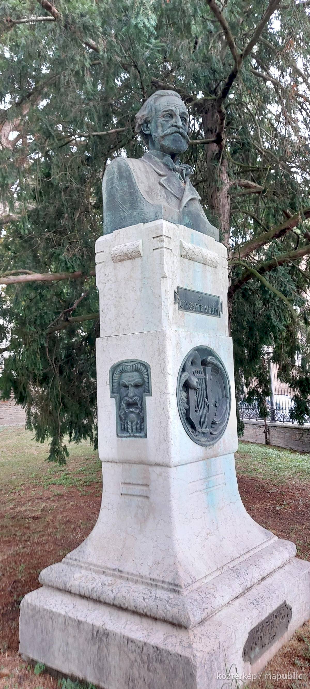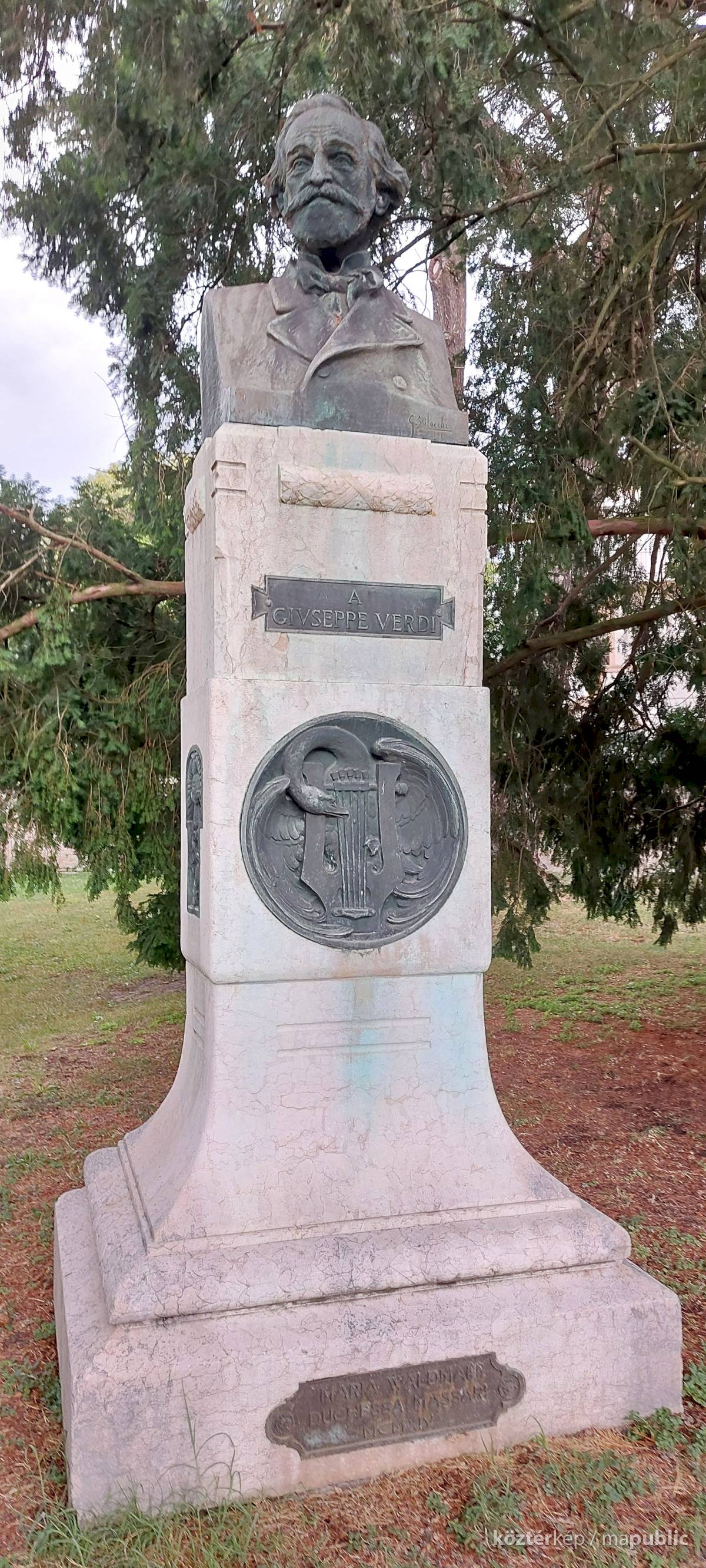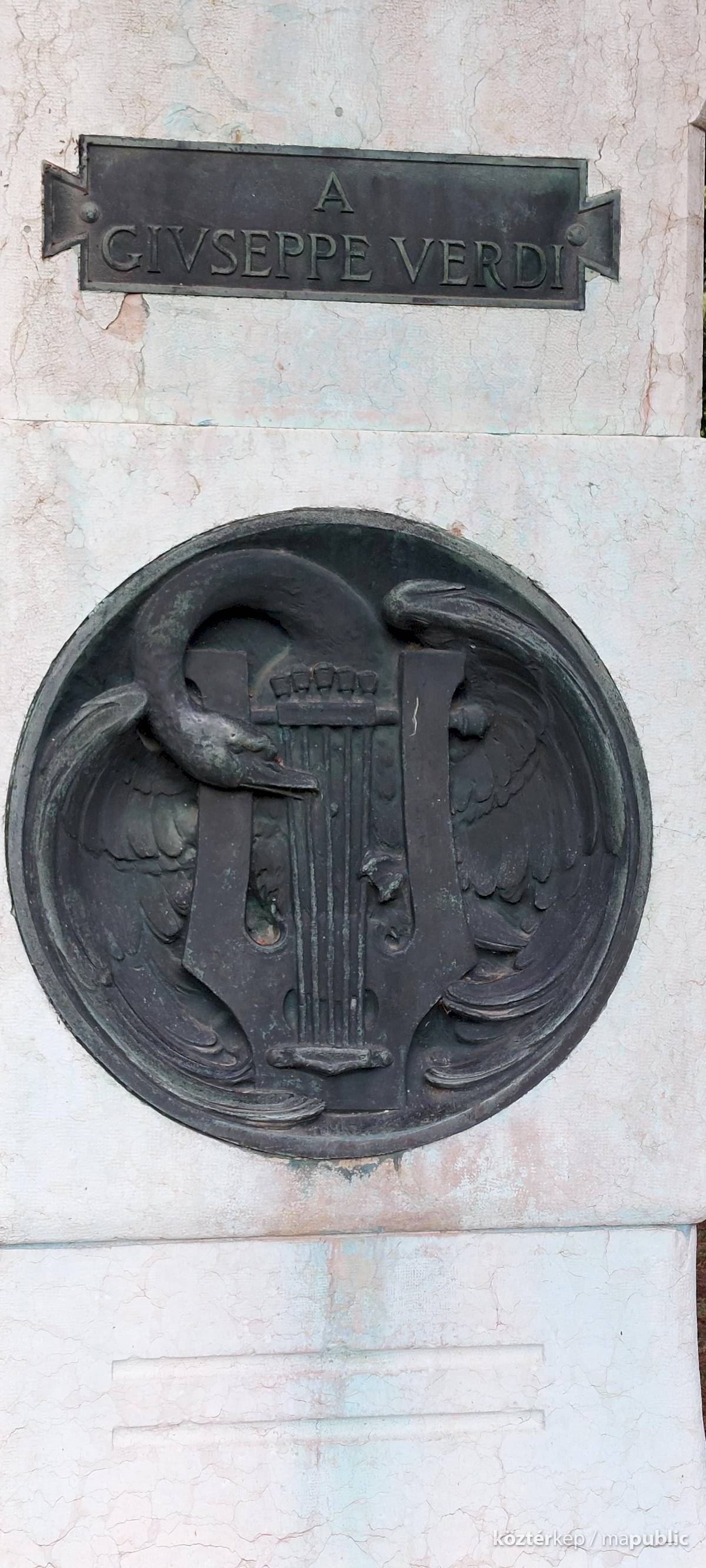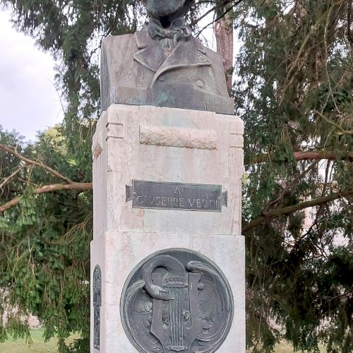 Nekem egyszer azt mondta egy történész, hogy minnél magasabban van egy szobor egy talapzaton, annál büszkébbek re, hisz mindig fel kell nézni rá. Nem tudom, hogy mennyi valóságalapja van a dolognak, de Verdi büsztje vagy 2 méter magasról nézett le rám. A művész élethűen ábrázolta az idősödő Verdit; arcvonásai markánsak, szakálla és frizurája is kellően részletes. A kor szelleme szerinti öltözéket visel: öltönyt, csokornyakkendővel. A szobor talapzatának oldalán elhelyezett domborművek zenei jelekként stilizált elemek, amelyek Verdi mesterségére utalnak.