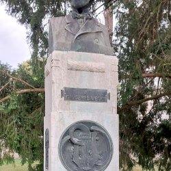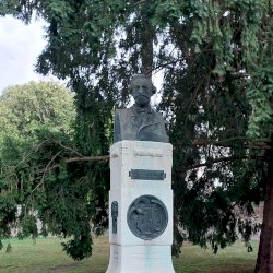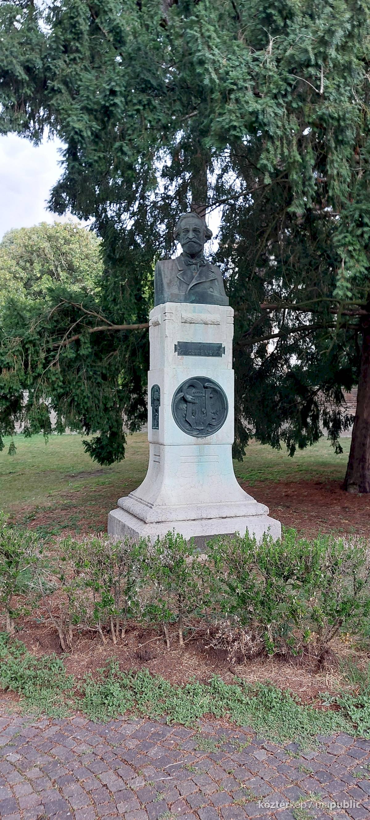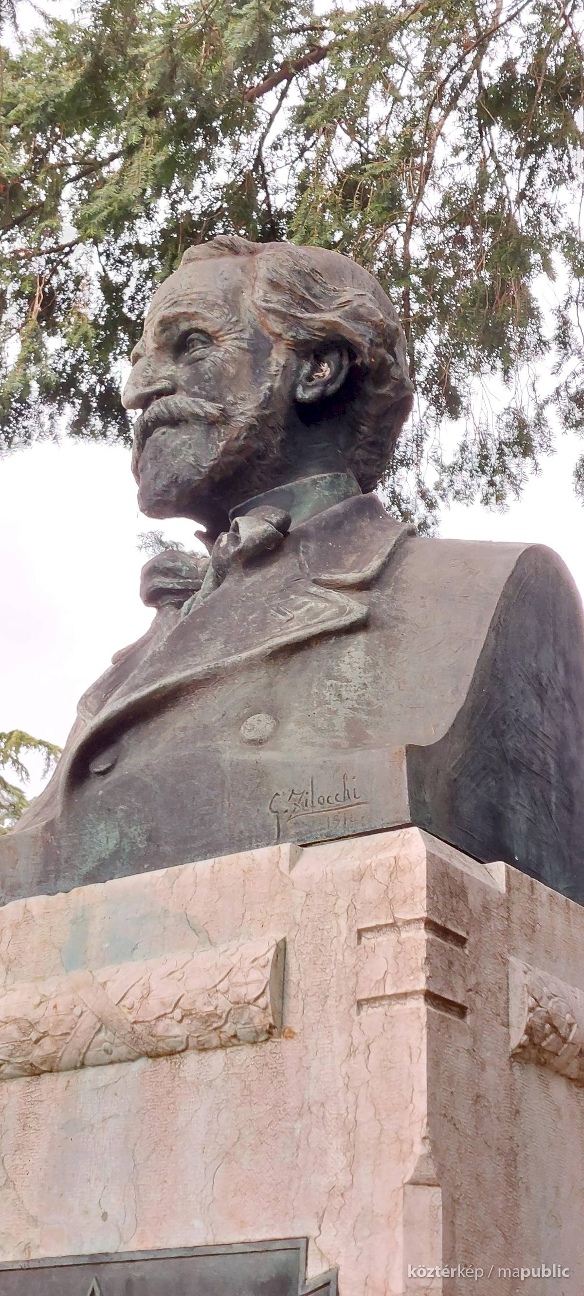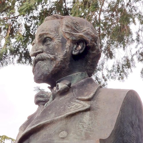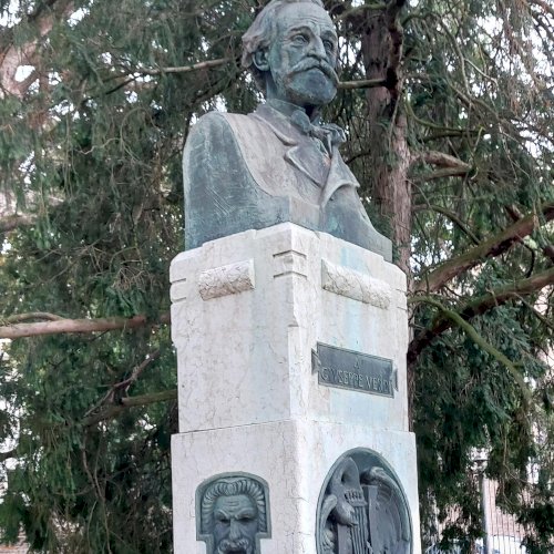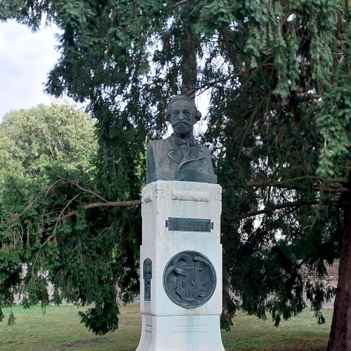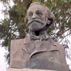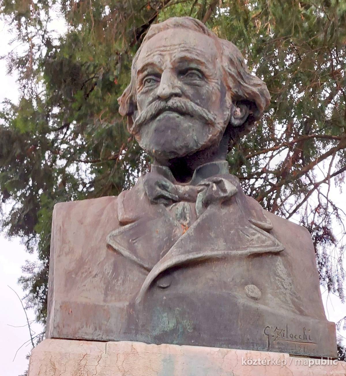 Nekem egyszer azt mondta egy történész, hogy minnél magasabban van egy szobor egy talapzaton, annál büszkébbek re, hisz mindig fel kell nézni rá. Nem tudom, hogy mennyi valóságalapja van a dolognak, de Verdi büsztje vagy 2 méter magasról nézett le rám. A művész élethűen ábrázolta az idősödő Verdit; arcvonásai markánsak, szakálla és frizurája is kellően részletes. A kor szelleme szerinti öltözéket visel: öltönyt, csokornyakkendővel. A szobor talapzatának oldalán elhelyezett domborművek zenei jelekként stilizált elemek, amelyek Verdi mesterségére utalnak.