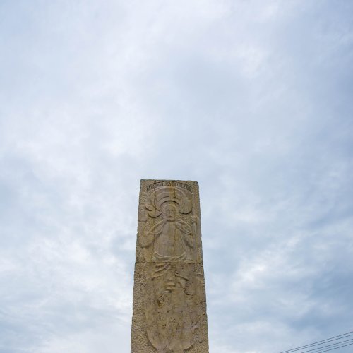 Az emlékmű egyik oldalán Krisztus-domborművet látunk. A keresztzászló Krisztus győzőmét és örök királyságát-, a bűn és halál feletti diadalát is szimbolizálja.