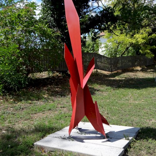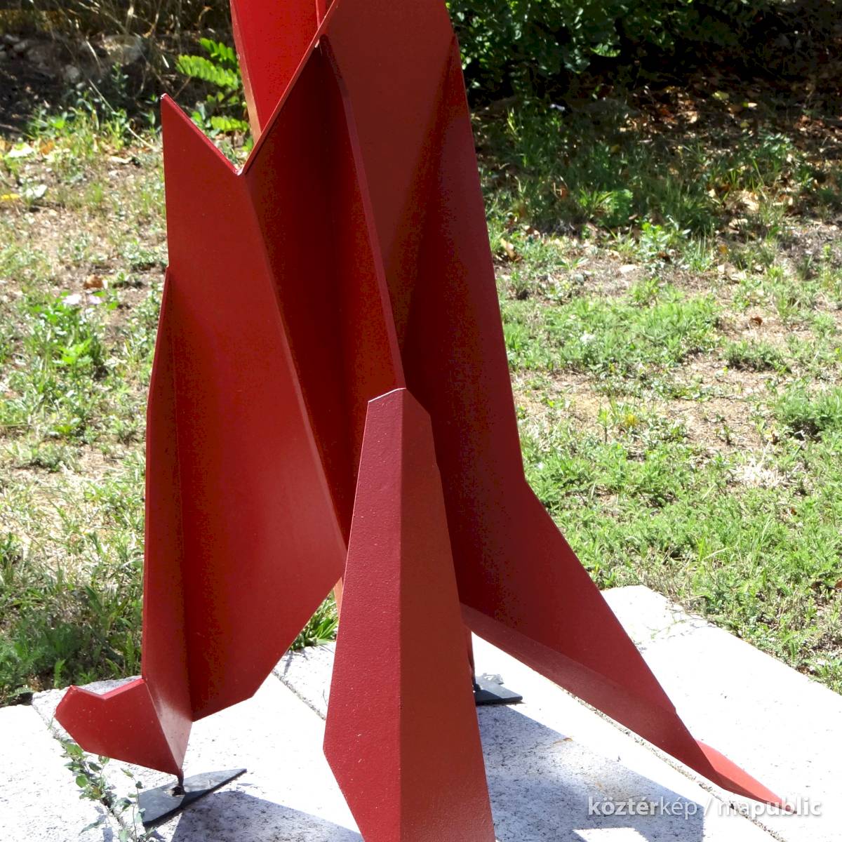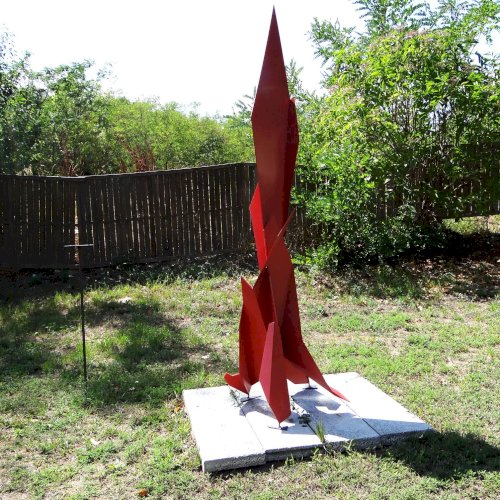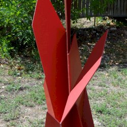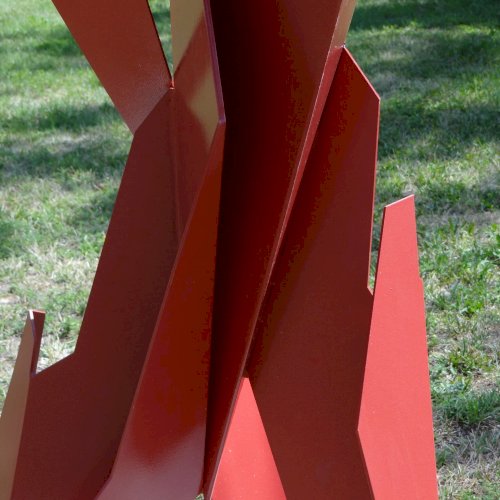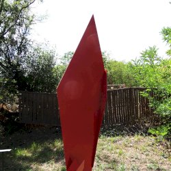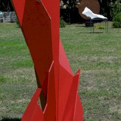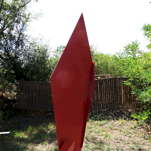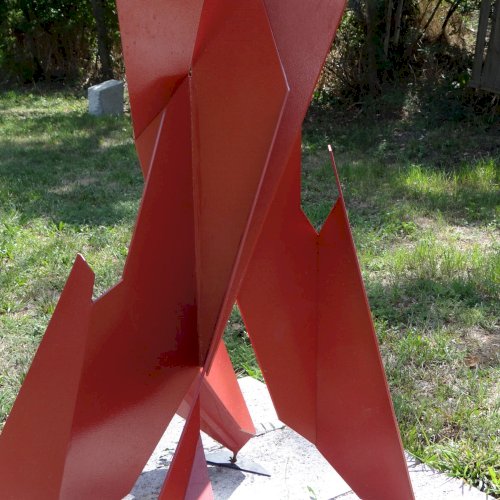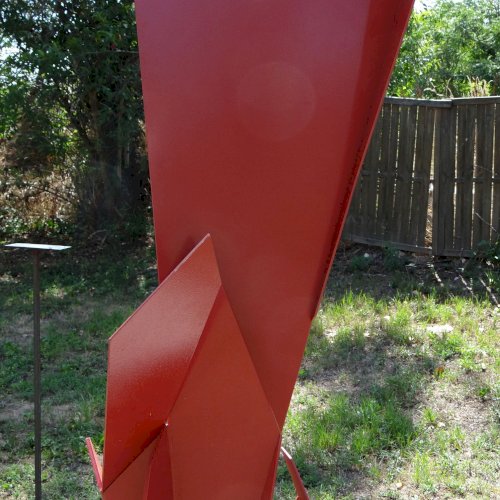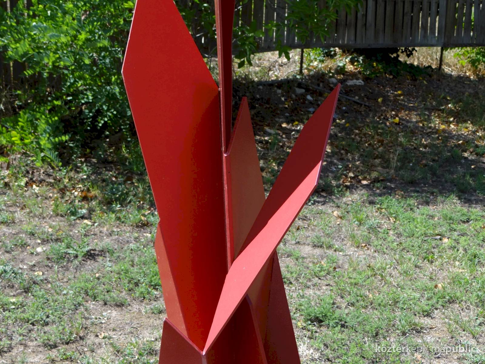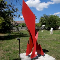 Plank Antal ugyancsak nem először vesz részt a köveskáli megmérettetésben. Úgy látom, idei pályaművével továbblép a korábbi Oregáme című, 2022-ben itt látott műve által rajzolt vonalán, bár nyílvánvalóan rokonok. Az origami gondolatisága tehát jelen van: "...ahogyan a papírlap hajtogatással háromdimenziós tárggyá válik, úgy bontotta ki ő is az acéllemezből az általa elképzelt dinamikus formákat." Ennek kapcsán pedig kérdések fogalmazódnak meg: