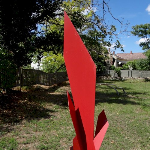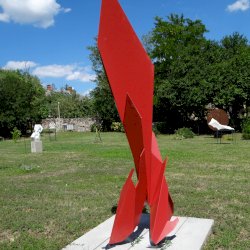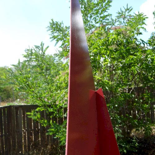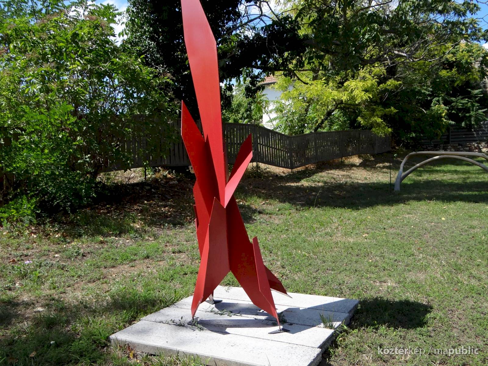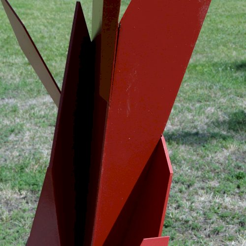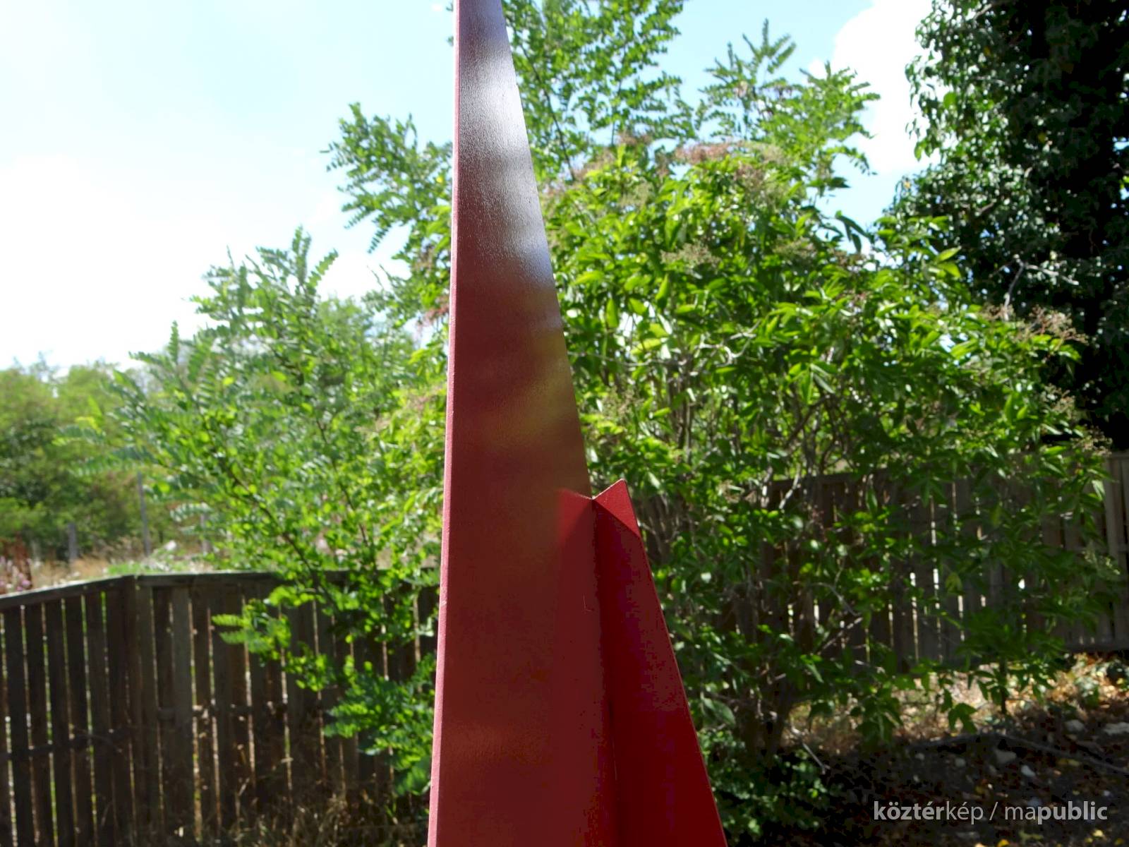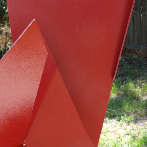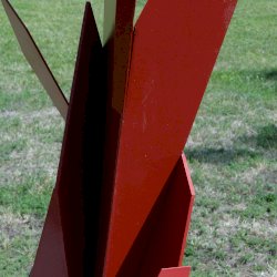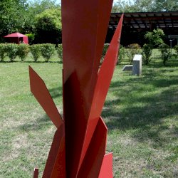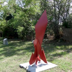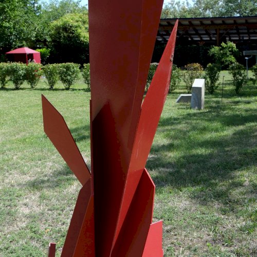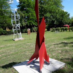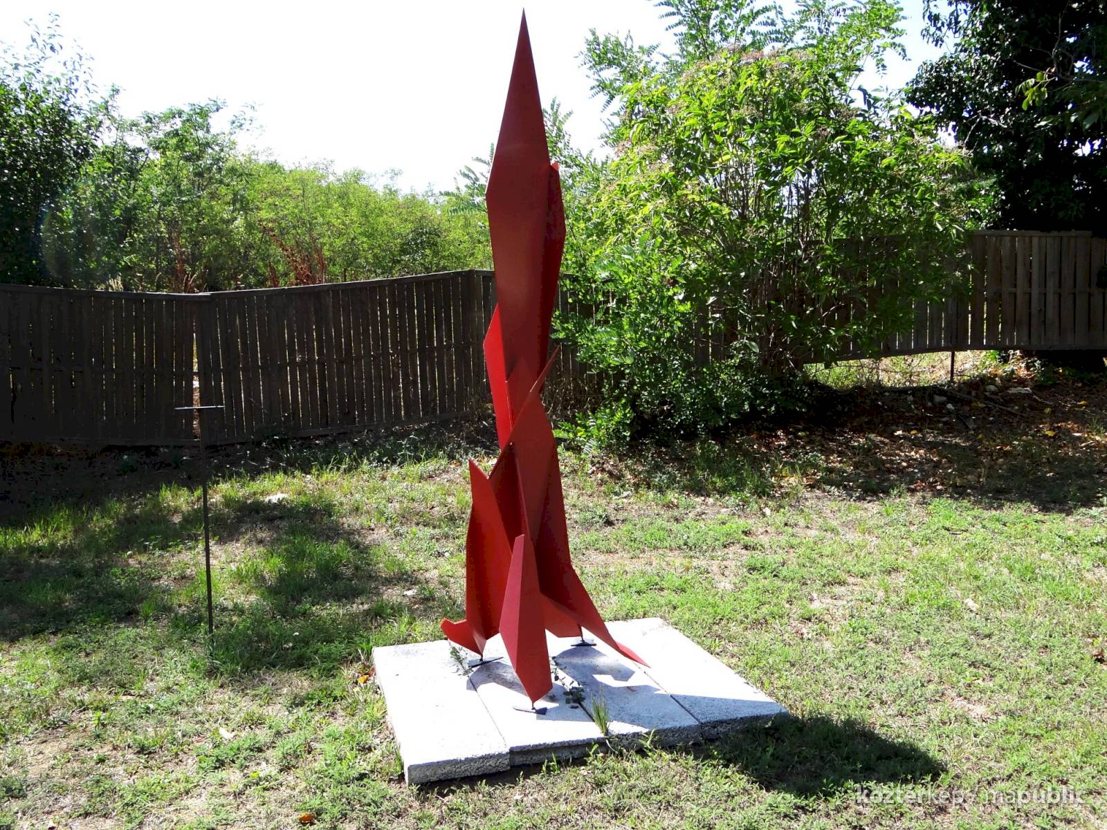 Plank Antal ugyancsak nem először vesz részt a köveskáli megmérettetésben. Úgy látom, idei pályaművével továbblép a korábbi Oregáme című, 2022-ben itt látott műve által rajzolt vonalán, bár nyílvánvalóan rokonok. Az origami gondolatisága tehát jelen van: "...ahogyan a papírlap hajtogatással háromdimenziós tárggyá válik, úgy bontotta ki ő is az acéllemezből az általa elképzelt dinamikus formákat." Ennek kapcsán pedig kérdések fogalmazódnak meg: