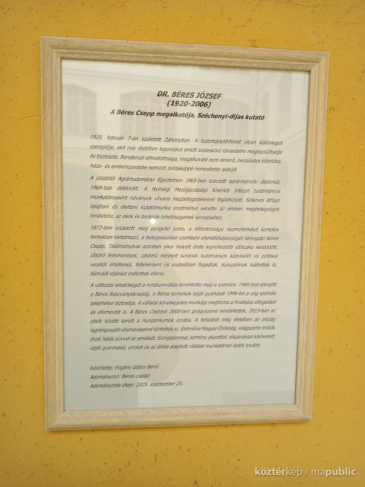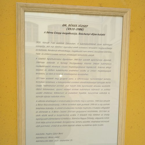 Az emléktábla domborművén id, Béres József arcképe látható. Avatásáról beszámoló, 2025. szeptember 25-i forrásban olvasható: