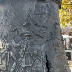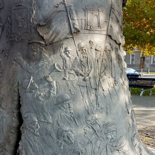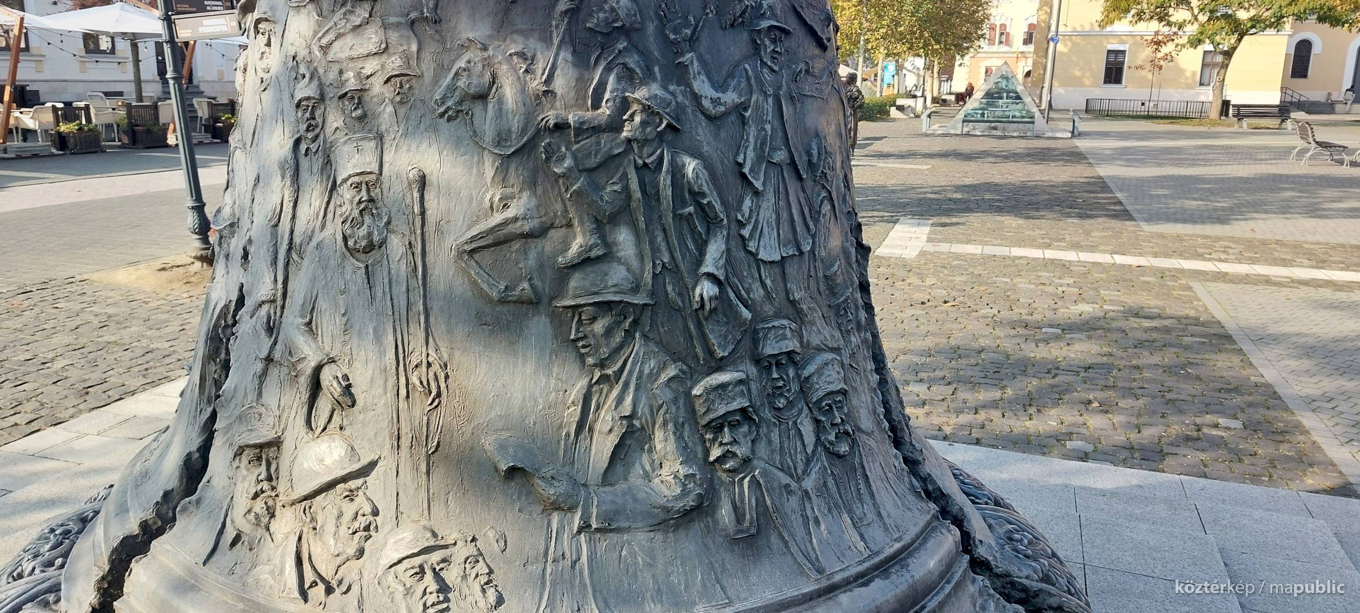 A harangon a nemzetgyűlésen részt vevőket mintázta meg Bintintan. Munkásokat, katonákat, papot és egyszerű embereket látunk, gyalogosan, lovon, zászlókkal vagy anélkül. A harang tetején hat fejet látunk hosszú nyakkal, négy nőt és két férfit, akik kivétel nélkül mosolyognak. Ez erős kontraszt, a harangon lévő többi személlyel.
