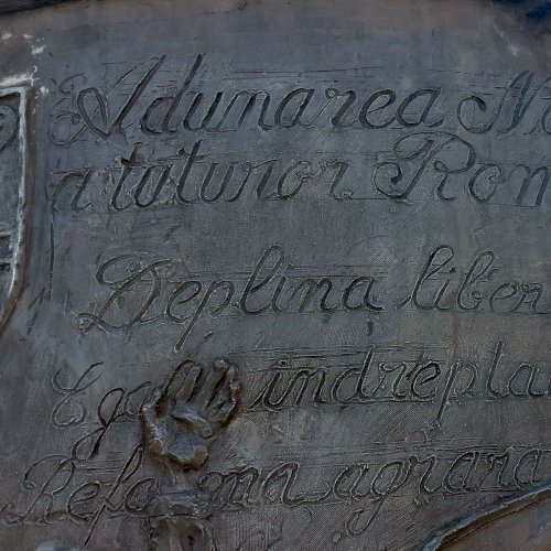 A román történelem egyik legfontosabb pillanatát testesíti meg, a bronzdarab, de kapcsolata magával a történelemmel nem több, mint szimbolikus. Sőt, a harangon lévő felirat miatt a történelem meghamisításáról is beszélhetünk. Az emlékmű idézi az Alba Iulia-i Nagy Nemzetgyűlés 1918. december 1-jei határozatának első bekezdésének részletét. Az eredeti dokumentum az erdélyi, bánsági és havasalföldi román nemzetgyűléséről szól, az erőd harangján a nyilatkozatban a mondat végén a „Țara Ungurească” (magyar föld) szerepelt, amit a szobrász önhatalmúlag „Țara Românească”-ra (román föld) cserélt. Ez így TÖRTÉNELEMHAMÍSÍTÁS.