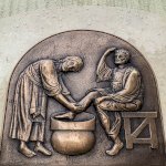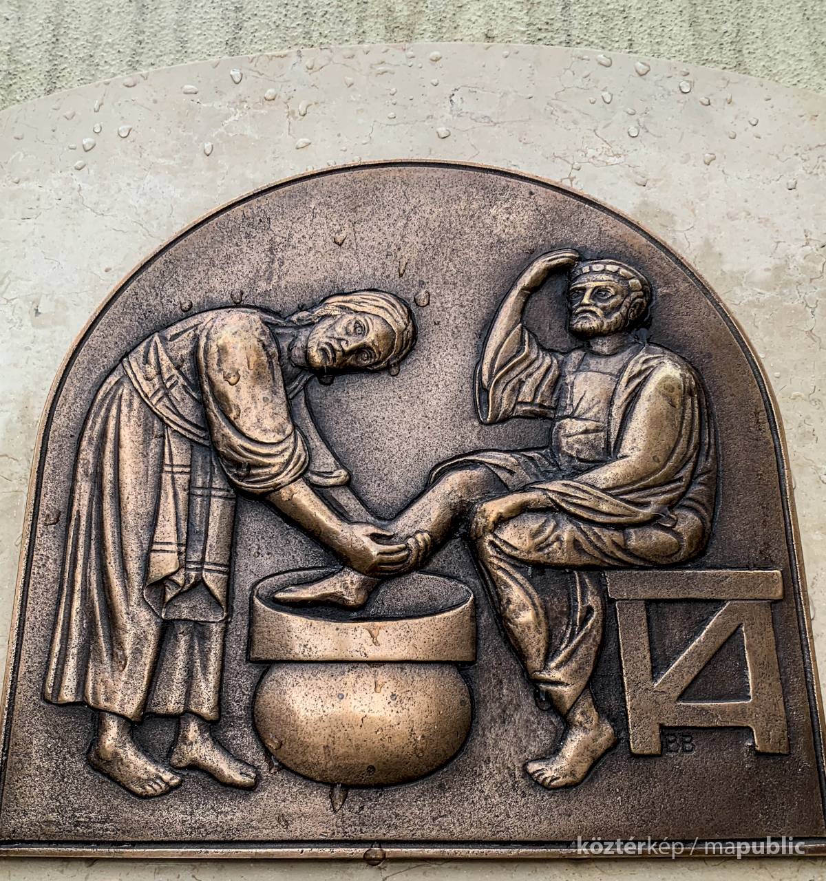 Az emléktábla azt az evangélumi jelenetet ábrázolja, ami János evangélumában olvasható: "Az utolsó vacsorai cselekmény sajátossága, hogy maga Jézus vállalkozik arra az aktusra, amely egyébként a rabszolgák feladata volt: leveszi a felsőruháját, egy vászonkendőt köt maga elé, majd sorjában megmossa és megtörli tanítványainak lábát." (Előzményt, következményeket ld. u. ott, a cikkben.) [3]