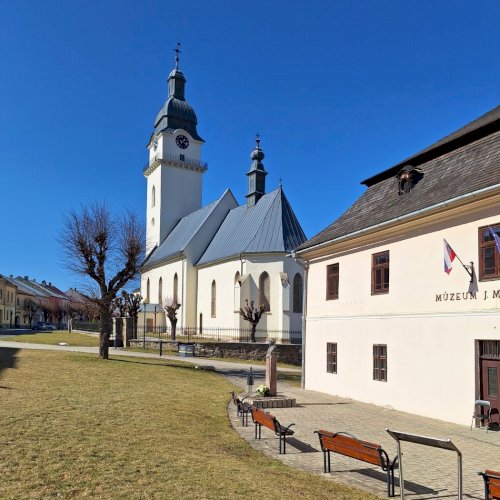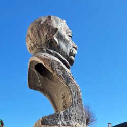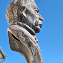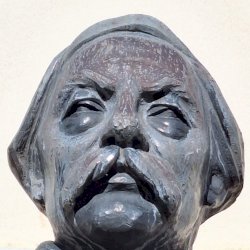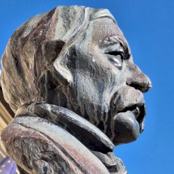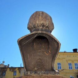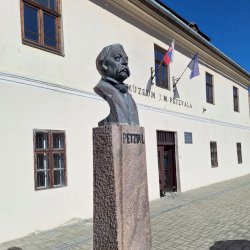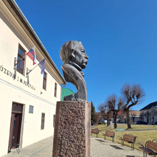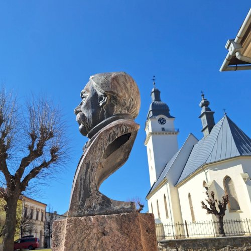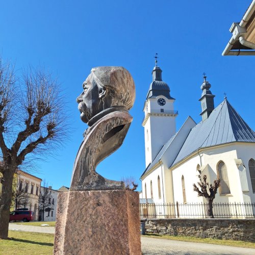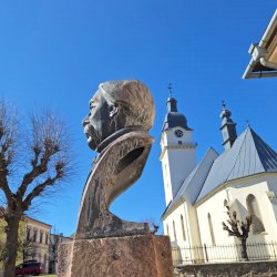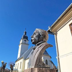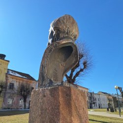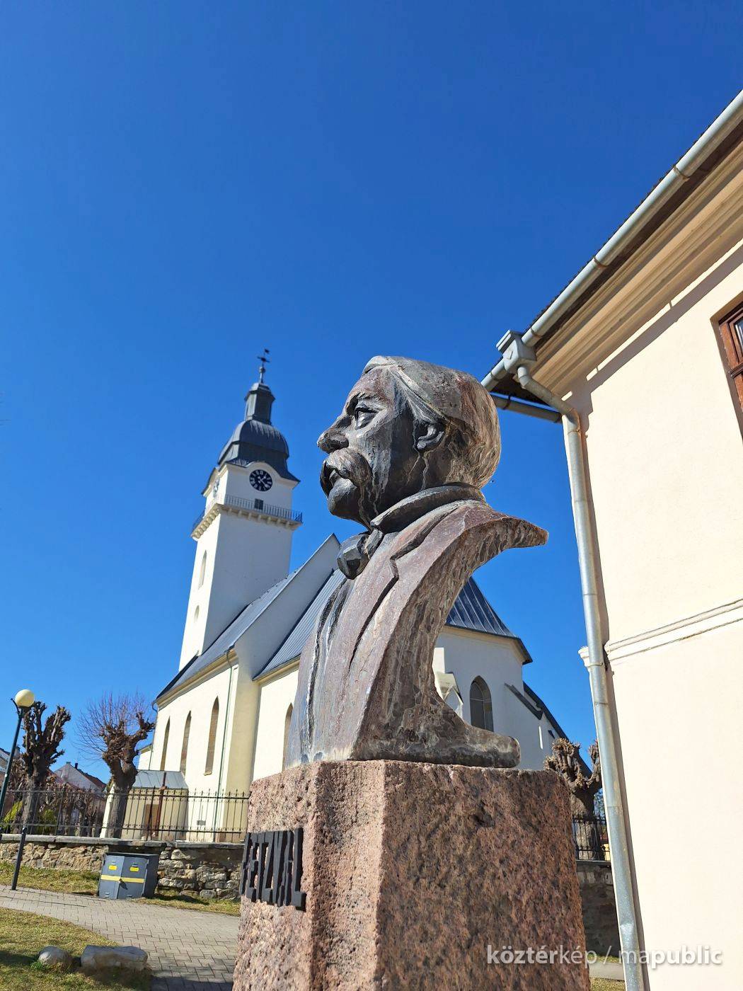 Löffler Béla kassai szobrász alkotta büsztje a múzeum előtt áll.